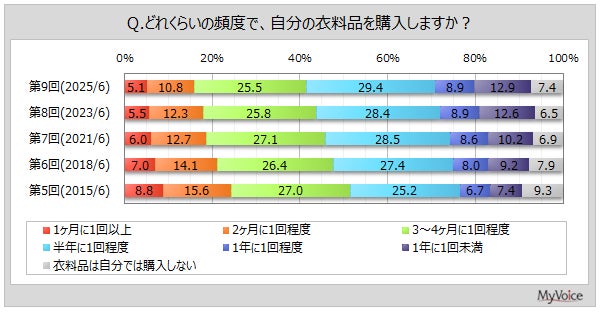 マイボイスコム株式会社(東京都千代田区、代表取締役社長:高井和久)は、9回目となる『衣料品の購入』に関するインターネット調査を2025年6月1日~7日に実施しました。