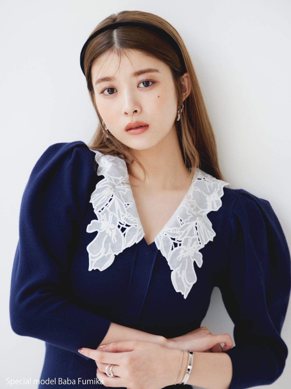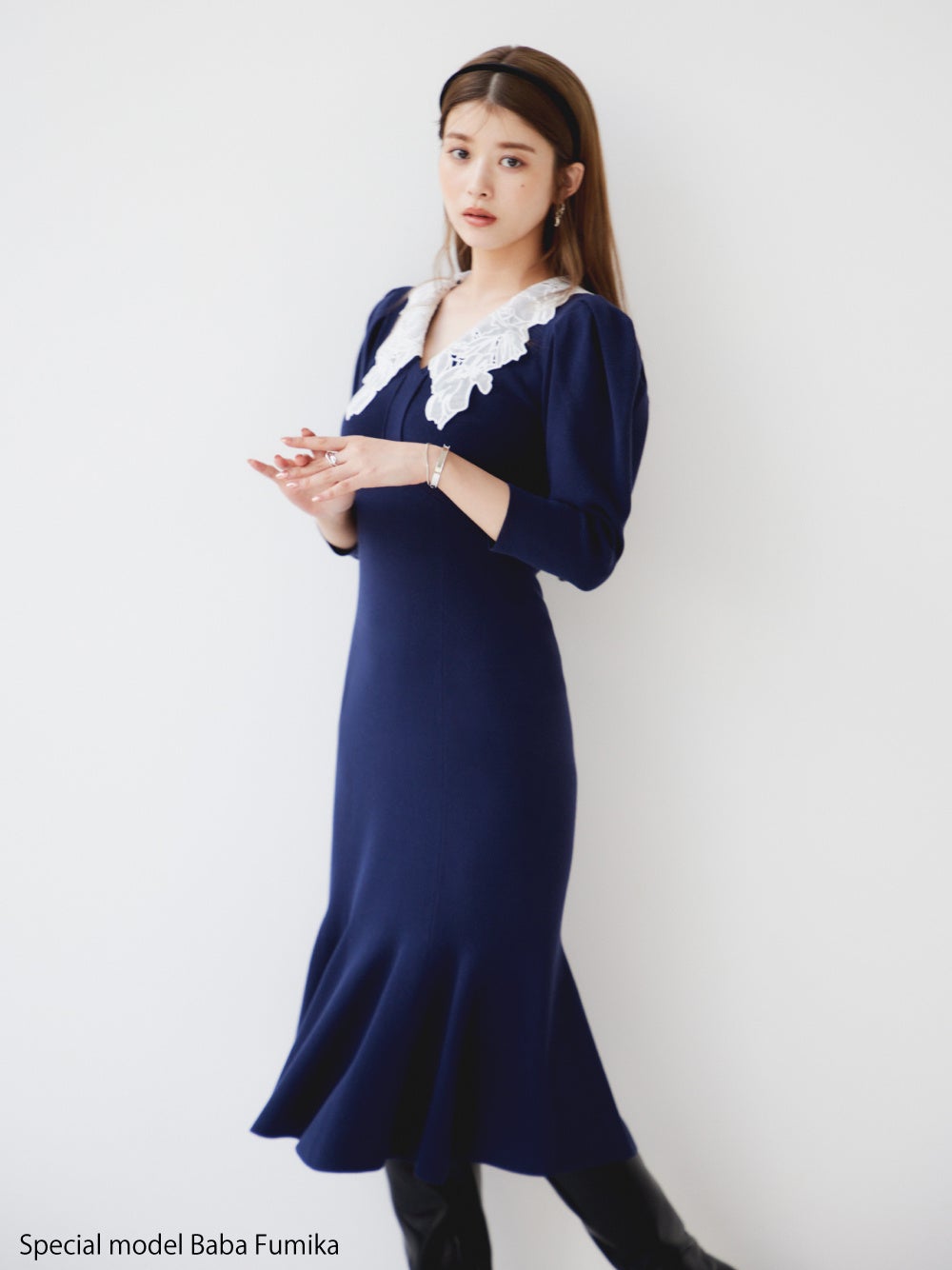 細やかな刺繍が施されたホワイトカラーが印象的な、クラシカルな雰囲気のニットワンピース。
