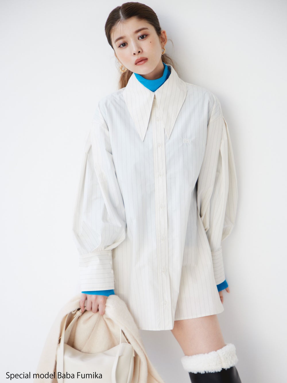 ビッグカラーや深めのタックをあしらいボリュームを出した袖など、こだわりのディテールがポイントになった、トレンドライクなシャツワンピース。身頃はAラインに広がるシルエットなのでミニワンピとしてはもちろん、チュニックとしてパンツとも相性抜群。フロントボタンを開ければ羽織としても着ることができ、万能なアイテムです。
