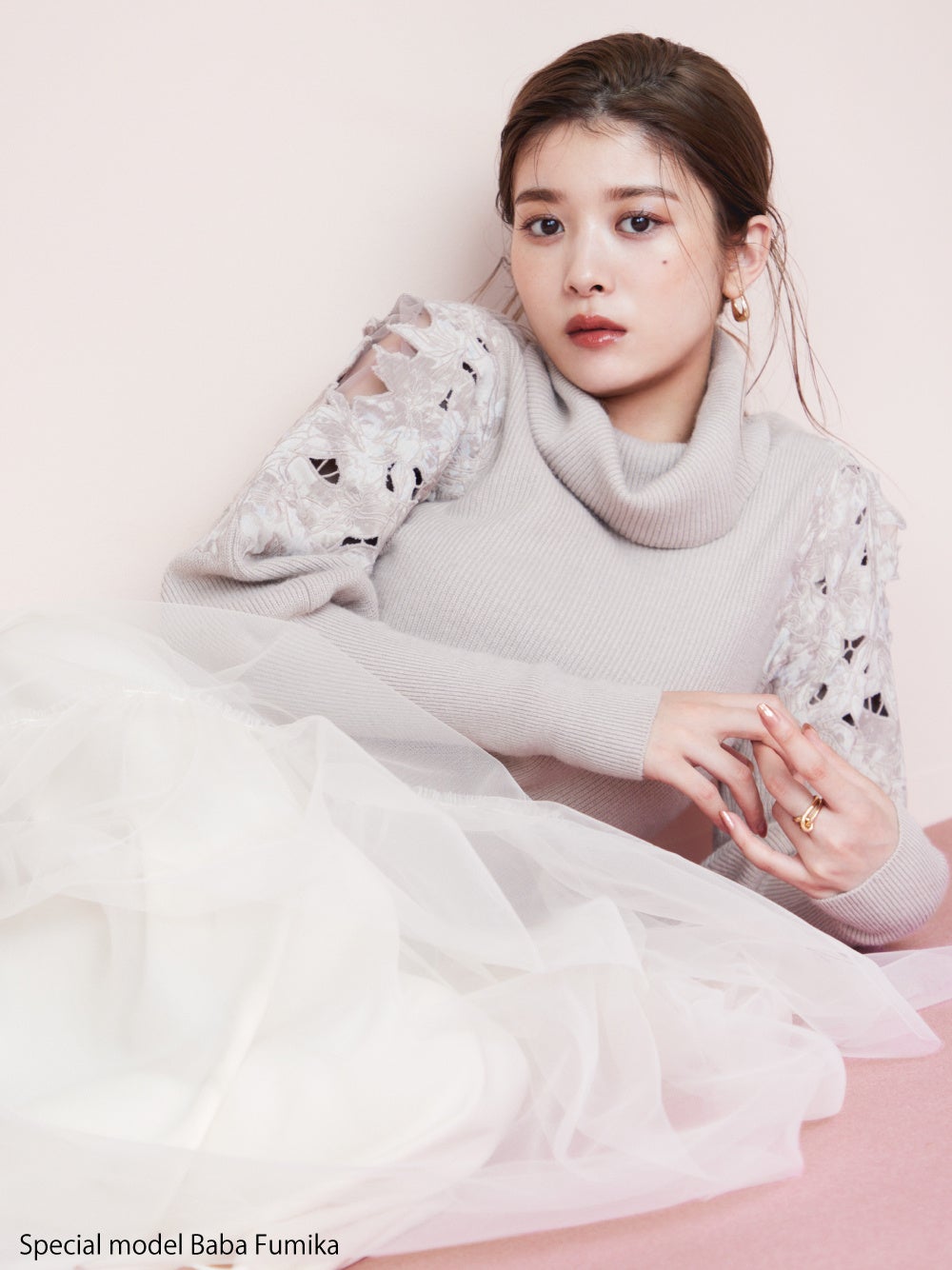 細やかな刺繍&カットワークが施されたショルダーデザインが印象的な、フェミニンムード溢れるニットプルオーバー。カット部分にはシアーなチュールを重ね合わせ、女性らしさを引き立てます。
