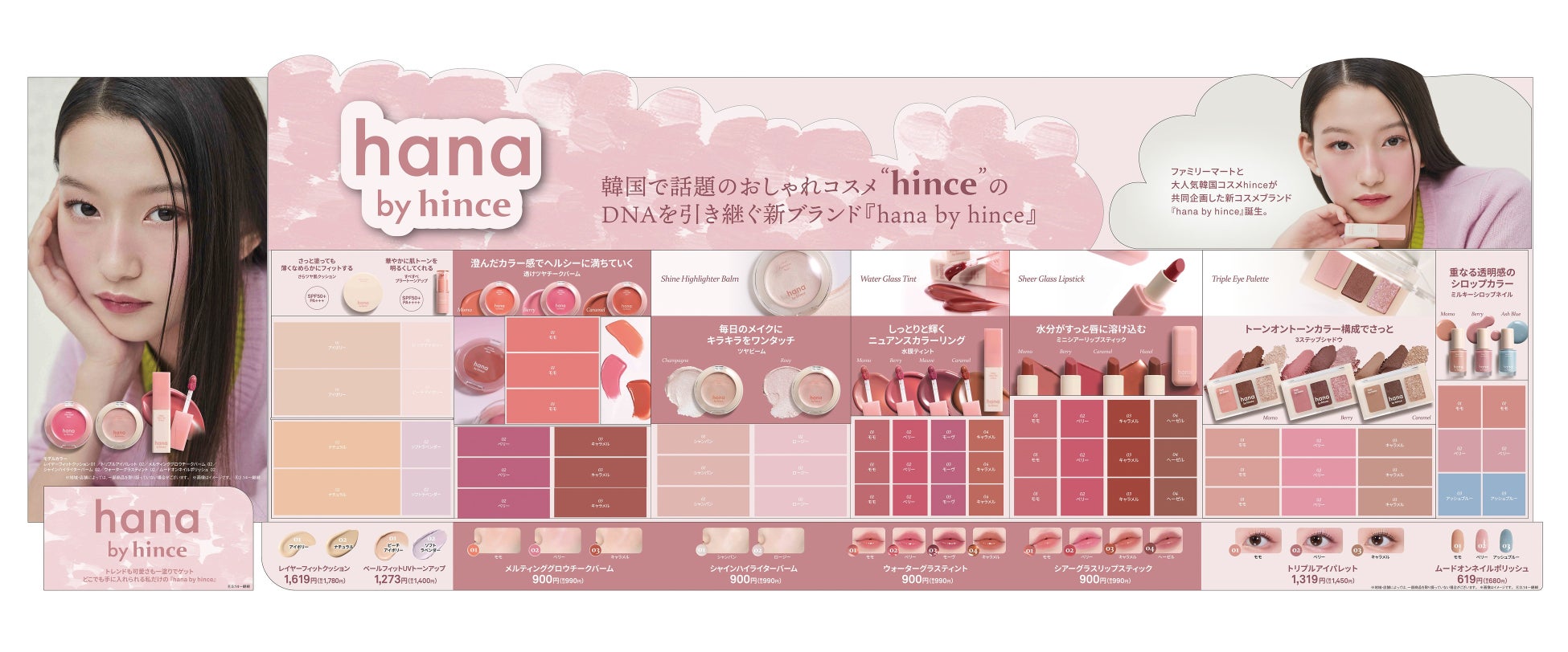 日本では、若年層を中心に韓国コスメの人気が高まっている中、ファミリーマートにおいても、10代~20代のお客さまにこれまで以上に店舗に足を運んでいただけるよう、人気メイクアップブランドの一つである「hince(ヒンス)」と共同開発し、新たにファミリーマート限定で姉妹ブランド「hana by hince(ハナバイヒンス)」を全国のファミリーマートで順次発売いたします。