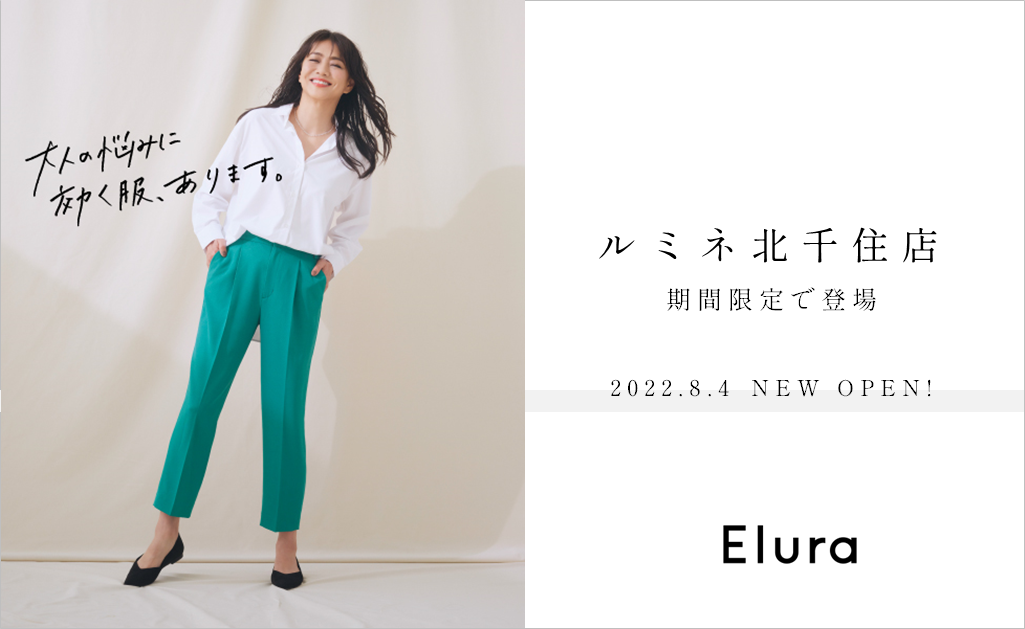 Elura(エルーラ)はアダストリアが展開する大人女性ブランドです。2019年10月のデビュー以来、化粧品のように“大人女性の悩みに効く”アイテムを提案してきました。コンセプトに共感した大人女性の支持を集めファンを増やしています。好調を受け、8月4日(木)に、ルミネ北千住6Fに期間限定店舗として初出店いたします。Eluraルミネ北千住店では、Eluraの人気No,1ボトムシリーズをはじめ、秋の最新作も多数ラインアップ。豊富なサイズ展開が魅力のEluraアイテムを、実際にお試しいただくことが可能です。