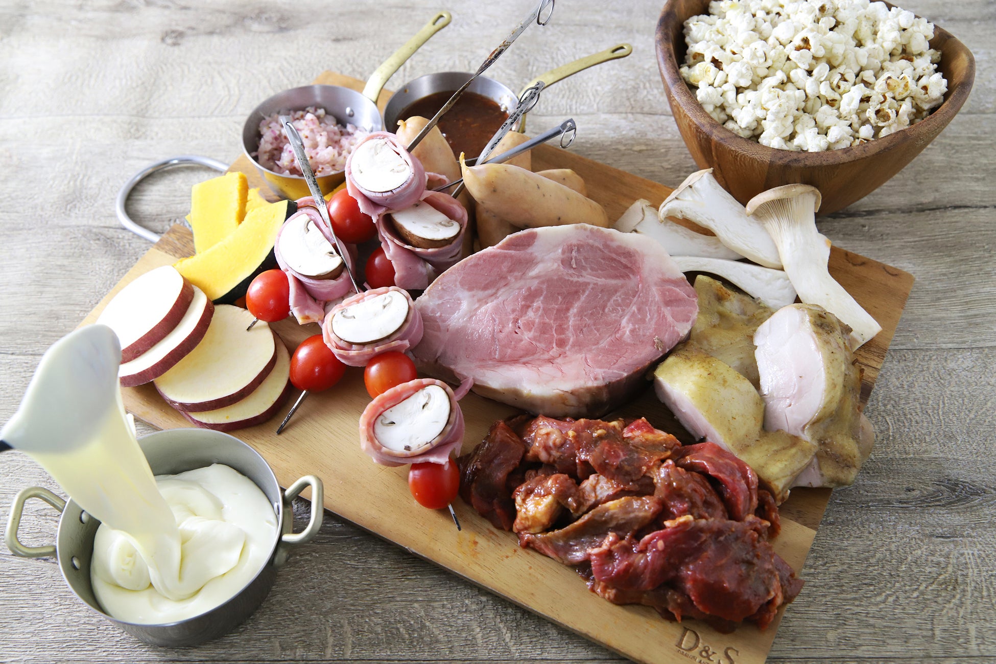 Chaque Jour EpanouiのBBQプレートは、ビーフ・ポークをメインにチキンや野菜も楽しめる、みんなでワイワイ焼いて楽しむスタイル。野菜串をチーズフォンデュで楽しむのもおすすめ。おかわり自由なおつまみポップコーンも。
