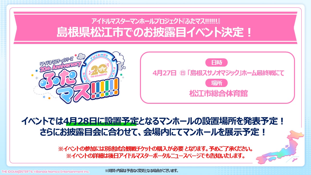 『ふたマス!!!!!!』第2弾「田中琴葉」(「アイドルマスター ミリオンライブ!」)のマンホールが設置される「島根県松江市」にてマンホールのお披露目会実施が実施が決定いたしました!