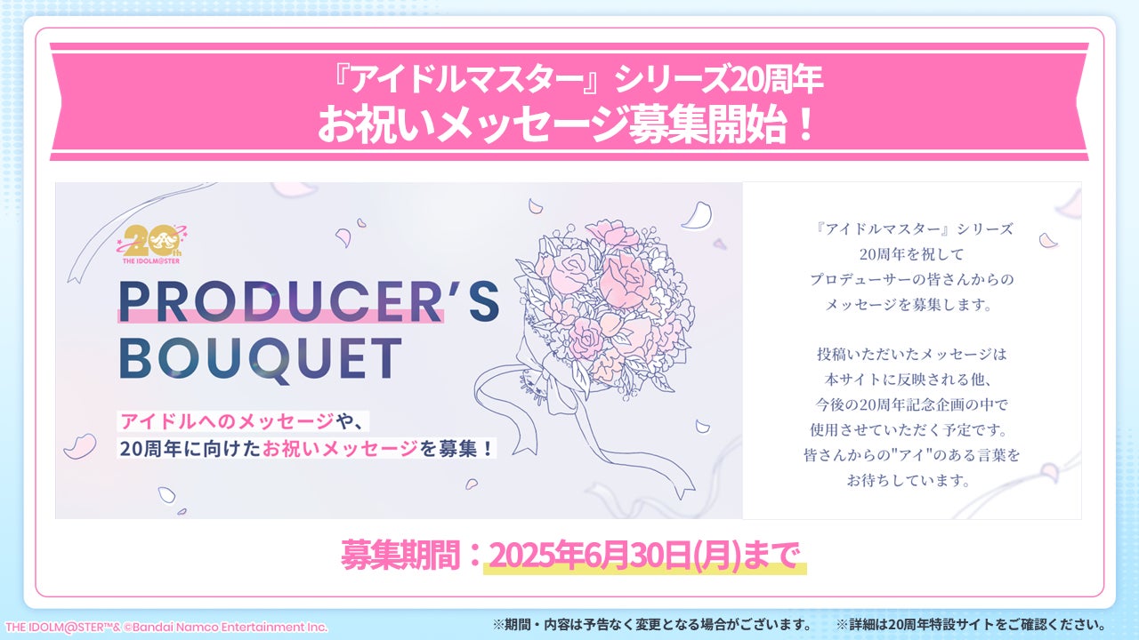 2025年7月26日(土)に迎える20周年当日を、プロデューサーのみなさんと一緒に盛り上げたい想いから、「20周年お祝いメッセージの募集」を実施いたします。