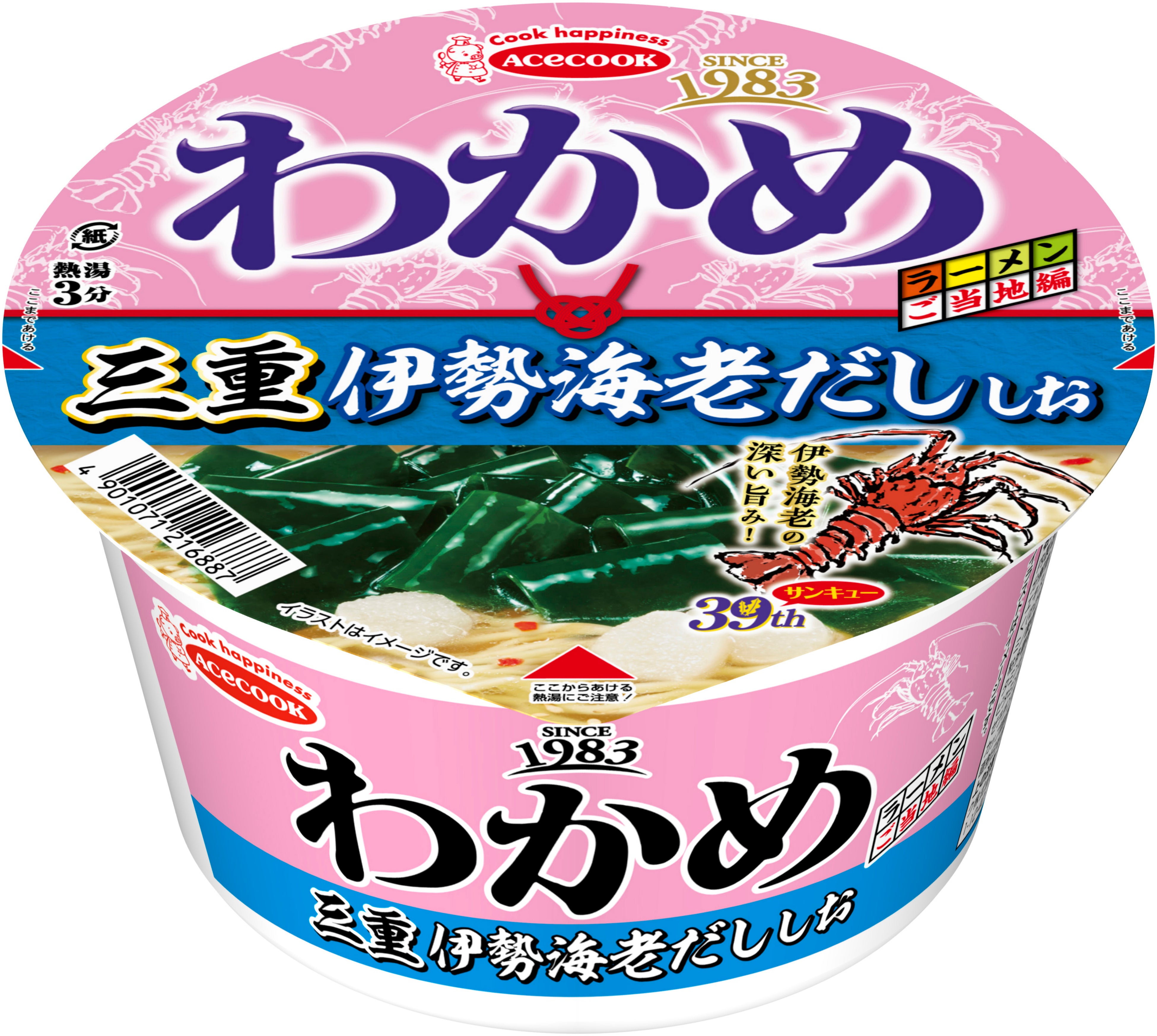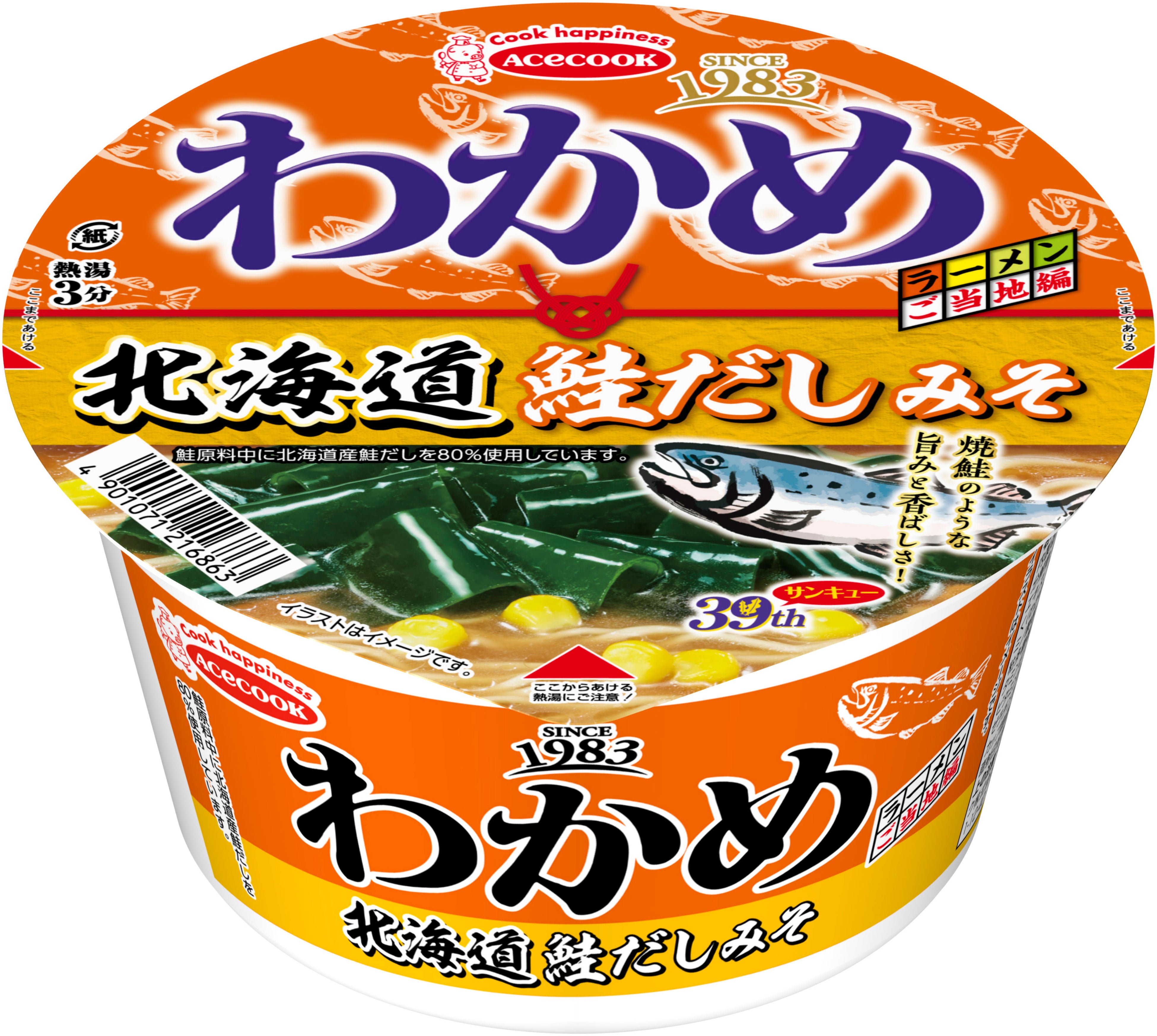 39周年(サンキューイヤー)の締めくくりとして、北海道産鮭だしの旨みや香ばしい香りを利かせた味噌ラーメン、秋田県産比内地鶏だしを使用したコクのある醤油ラーメン、三重県産伊勢海老だしの香ばしい風味が広がる塩ラーメンの3品を発売。選び抜かれたご当地食材のだしを使用した、現地に行かずとも各地のおいしさを堪能することが出来る、とっておきのわかめラーメンです。