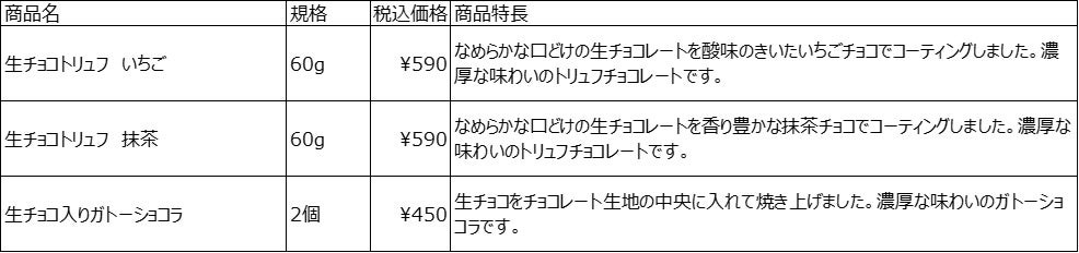 今回、冬限定商品として、チョコレートに生クリームを加えて仕上げる生チョコを使った、生チョコシリーズを新たに発売します。生チョコを使うことで、濃厚なチョコレートを味わいつつ、なめらかな口溶けをお楽しみいただけます。「生チョコトリュフ いちご」はフルーツの酸味と、「生チョコトリュフ 抹茶」は抹茶の香りとほろ苦さを生チョコレートと一緒にご堪能いただけます。「生チョコ入りガトーショコラ」は、チョコレート生地の中に生チョコレートを入れて焼き上げており、濃厚な味わいが特長です。