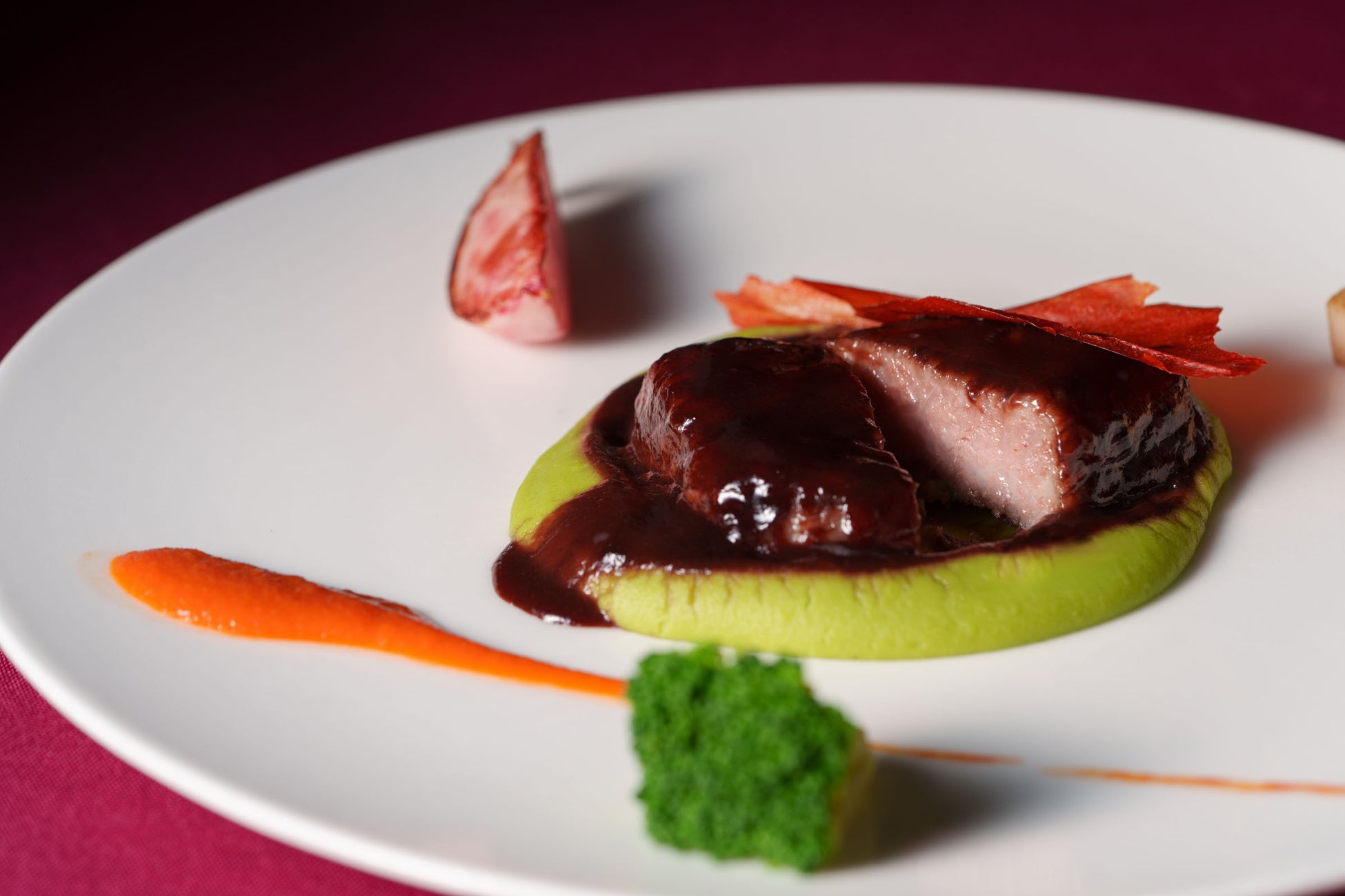 愛しい方とのかけがえのないひとときや、プロポーズのメッセージを伝えるには絶好のロケーション。レッド・グリーンなどのクリスマスカラーをモチーフに、シャンパンやフリーフローのワインなどとともに楽しめる料理の数々が並びます。オードブルは、オマール海老のカダイフ巻きや、蟹のタルトレット、サーモンとビーツのタルタル、フォアグラとマスカルポーネチーズのグジェールなど、全8品をティースタンドで提供。メインディッシュは、国産牛を赤ワインで軽く煮込んだこころをも満たす温かい一皿。ほろ苦い雪菜のマッシュポテトとともにお楽しみいただけます。デザートは、ピスタチオのペーストを、クリスマスオーナメントに見立てた洋なしのムースで包み込みました。甘酸っぱいベリーのソースとともにお召し上がりください。