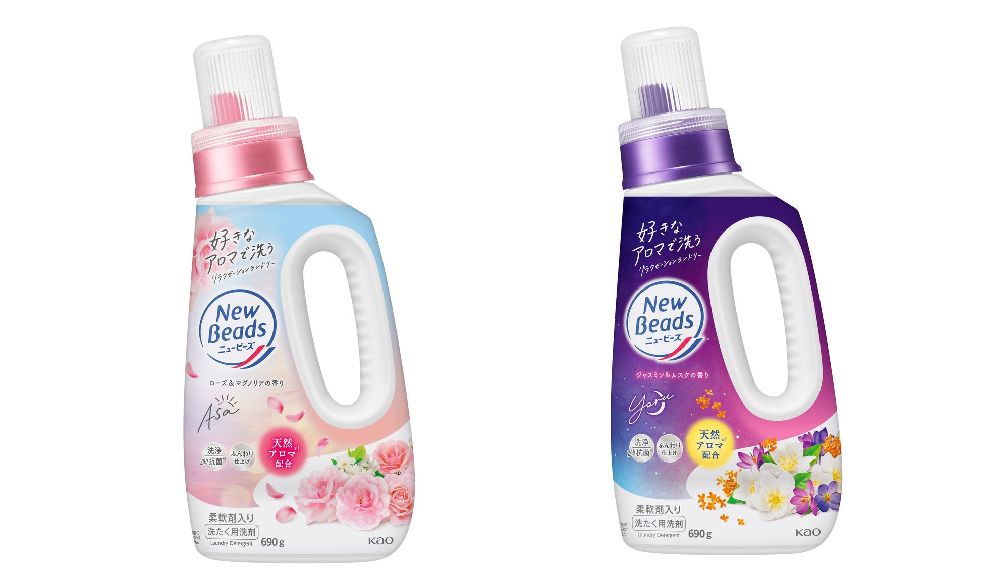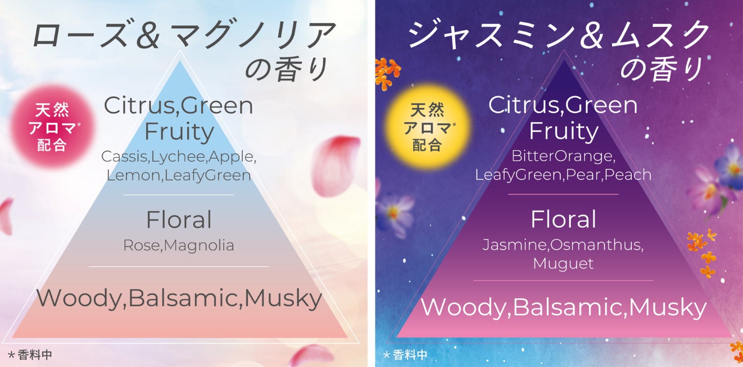 朝の洗たくには、リフレッシュ気分の「ローズ&マグノリアの香り」、夜の洗たくには、リラックス気分の「ジャスミン&ムスクの香り」、朝と夜の気分に合わせた2つの香りのラインナップを揃えました。
