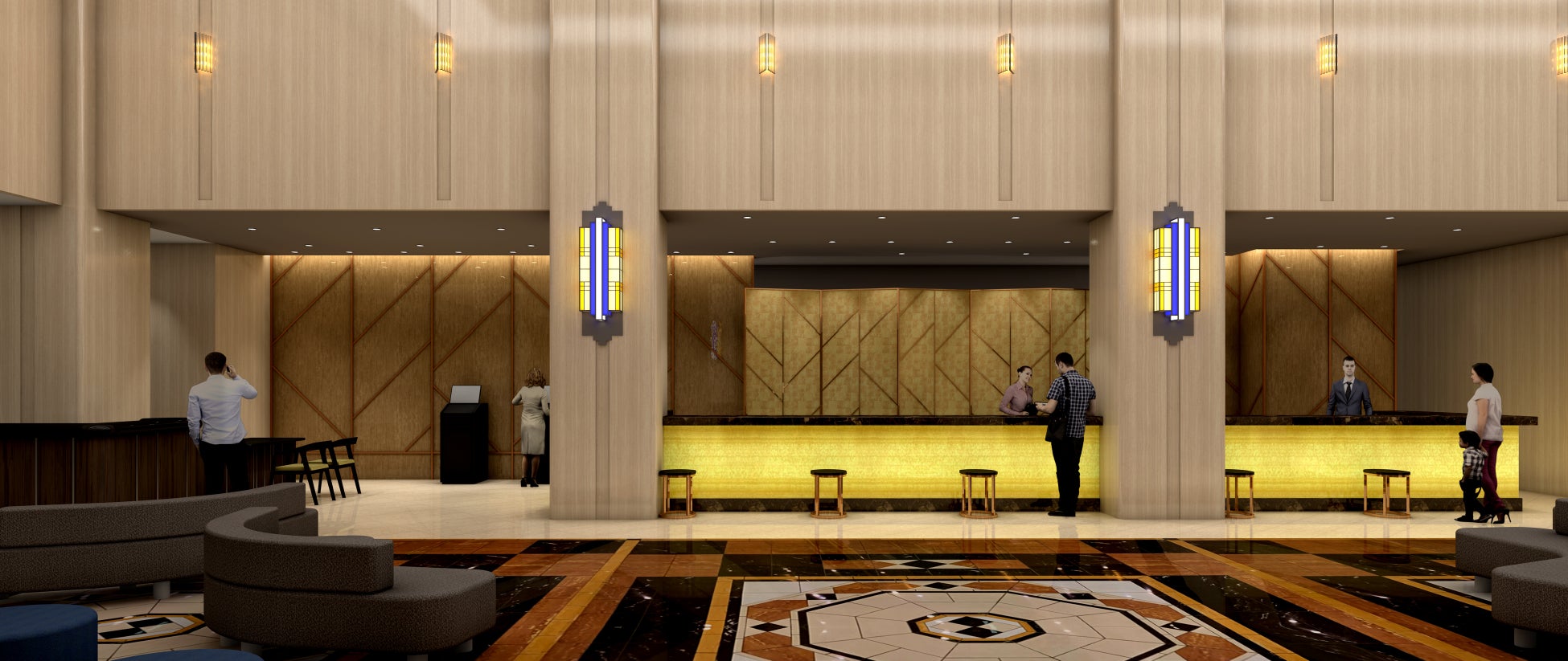 新たなフロントデスクは“金色”を基調とし、東京・池袋という都市にあるホテルとしての華やかさや艶感、メトロポリタンホテルズのフラグシップホテルとしての品格や洗練された空間を表現します。国内外のお客さまがいらっしゃるホテルとして、フロントデスク後方には金屏風をイメージした壁を設え、日本文化の要素を取り入れます。また、長年の歴史が刻まれたロビーの床面の大理石や柱の照明などの一部はそのまま残し、新旧を融合させることで50年、100年と、引き続きお客さまに愛されるホテルを目指し生まれ変わります。