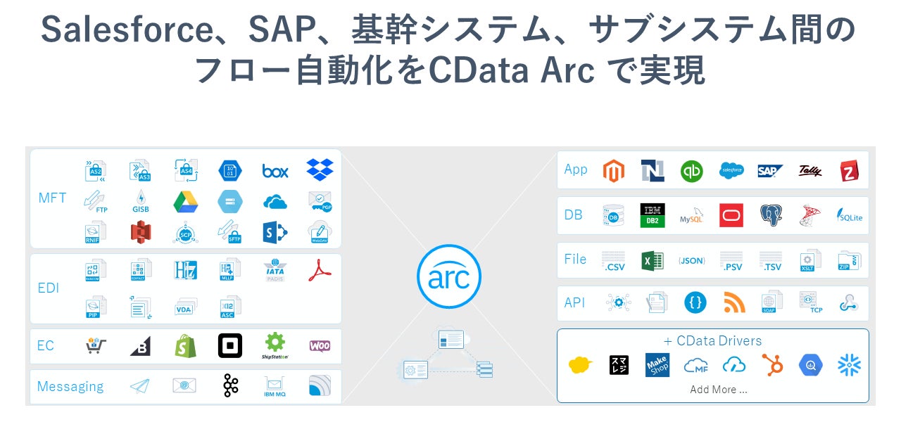 多様なコネクタとフロー自動化を行うCData Arc で、エンタープライズで利用されるSalesforce、SAP とスクラッチシステムの連携や連携サブアプリ開発による自動化促進を実現します。