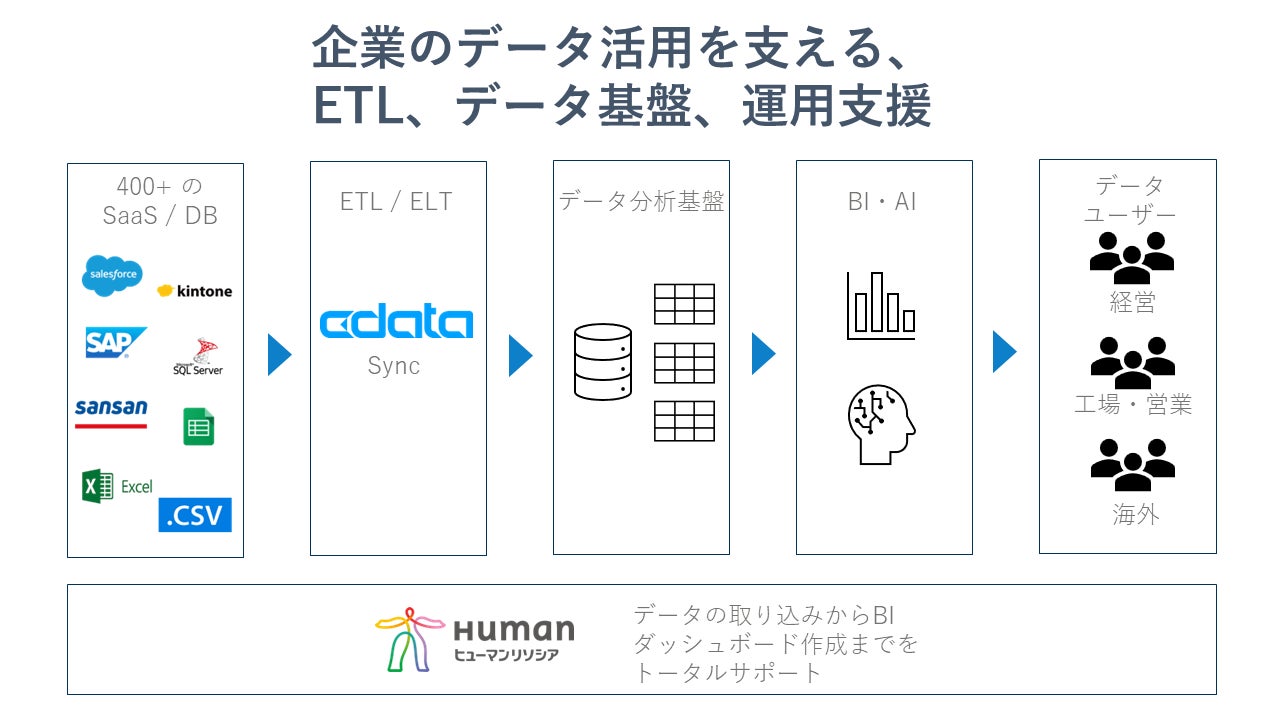 総合人材サービス会社で、DXソリューション利活用支援サービスを展開するヒューマンリソシア株式会社(本社:東京都新宿区、代表取締役:高橋 哲雄、以下「当社」)はこのたび、DX利活用支援サービスの拡充に向け、CData Software Japan 合同会社(本社:アメリカノースカロライナ州、日本オフィス:宮城県仙台市、代表社員 職務執行者:疋田 圭介、以下「CData社」)と協業を開始します。同社の提供するデータ統合基盤やデータ連携ソリューションの販売を開始するほか、同製品の導入にあたるコンサルティングやエンジニアによる支援サービスの提供も予定しており、CData社と連携し、企業におけるデータ利活用の推進を支援していく方針です。