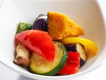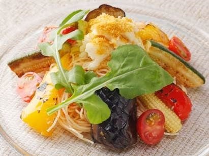 ズッキーニ、ナス、パプリカなど夏野菜をたっぷりと盛り合わせた極細パスタです。