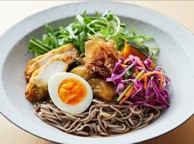 焼きなすのおひたしにかぼちゃの煮物、鶏ささみの天ぷら、紫キャベツの和さらだ、生野菜などの具材をそばと一緒に味わえ、味の変化を愉しめます。