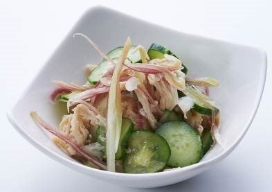 夏野菜の胡瓜と茗荷をふんだんに盛り込み、まろやかな千鳥酢で和えた夏の一品です。