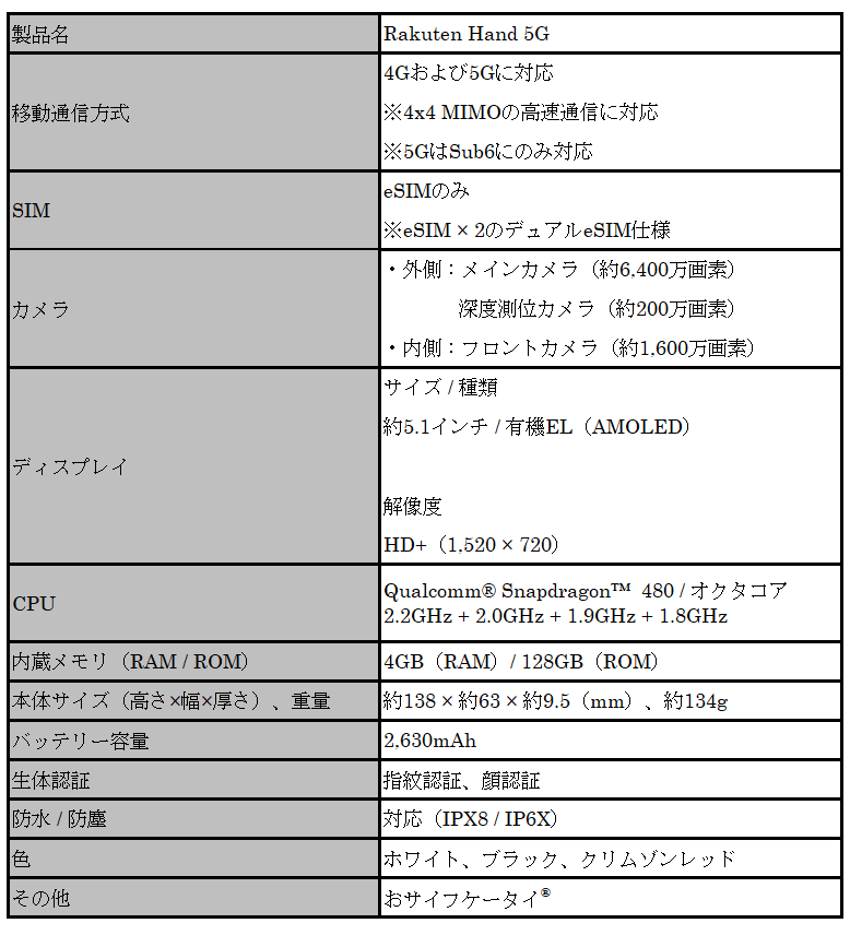 スリムな本体デザインながらも、約5.1インチの有機ELディスプレイや、動画再生最大20時間、音楽再生最大50時間が可能なバッテリーを搭載しています(注4)。防水(IPX8)・防塵(IP6X)機能、指紋・顔による生体認証、おサイフケータイ®を搭載するなど、便利な機能を多数搭載しています(注5)。「Rakuten Hand 5G」はデュアルeSIMにも対応しています。