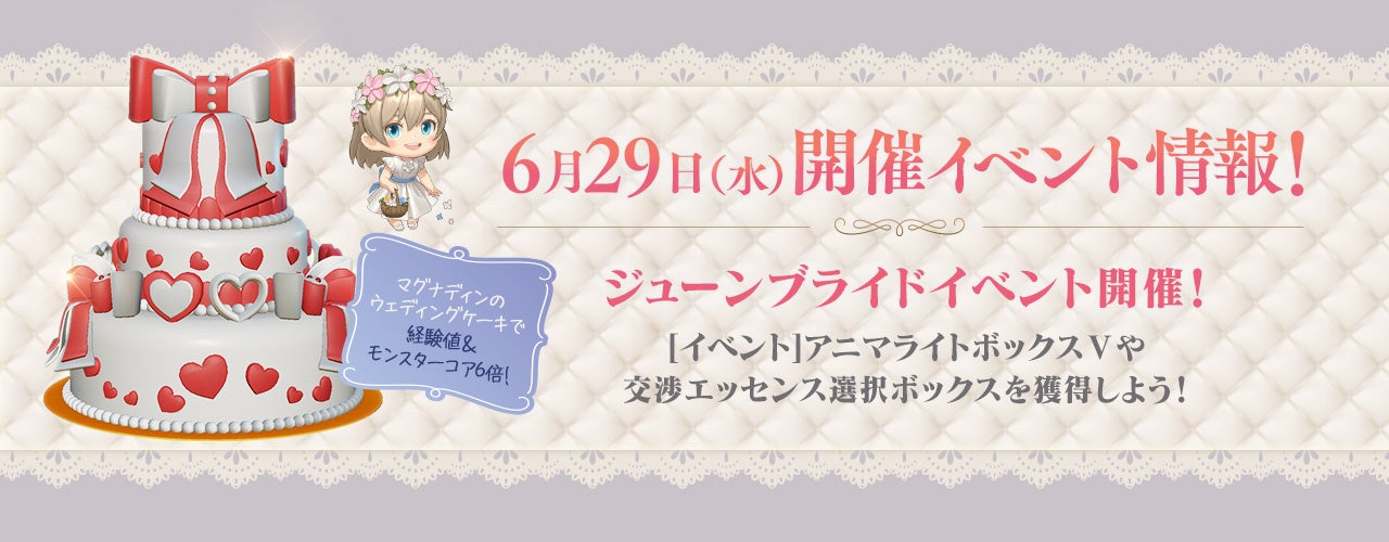 イベント期間中にマグナディンに入場すると、設置されているウェディングケーキより経験値獲得量とモンスターコア獲得率が5時間のあいだ6倍になるバフを獲得できるイベントや、イベントに参加することで「[イベント]アニマライトボックスⅤ」や「工匠エッセンス選択ボックス」、「[ヴァラカス]ヒーロー召喚ボックス専用召喚チケット」など豪華アイテムを獲得できる「ジューンブライドイベント」を開催いたします。
