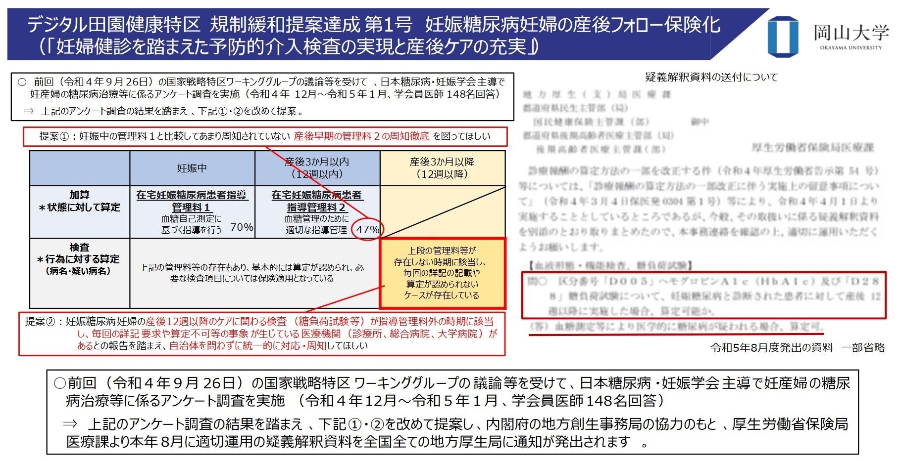 【岡山大学】デジタル田園健康特区 吉備中央町 規制緩和提案達成 第1号 ~妊娠糖尿病妊婦の産後フォローの明確化「妊婦健診を踏まえた予防的介入検査の実現と産後ケアの充実」~