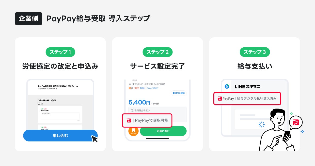 LINEヤフー株式会社(以下、LINEヤフー)とPayPay株式会社(以下、PayPay)は、LINEヤフーが提供する、企業とユーザーの「スキマ時間」をマッチングする単発雇用サービス「LINEスキマニ」において、PayPayが提供する給与デジタル払いサービス「PayPay給与受取」(以下、本機能)への対応を本日より開始します。