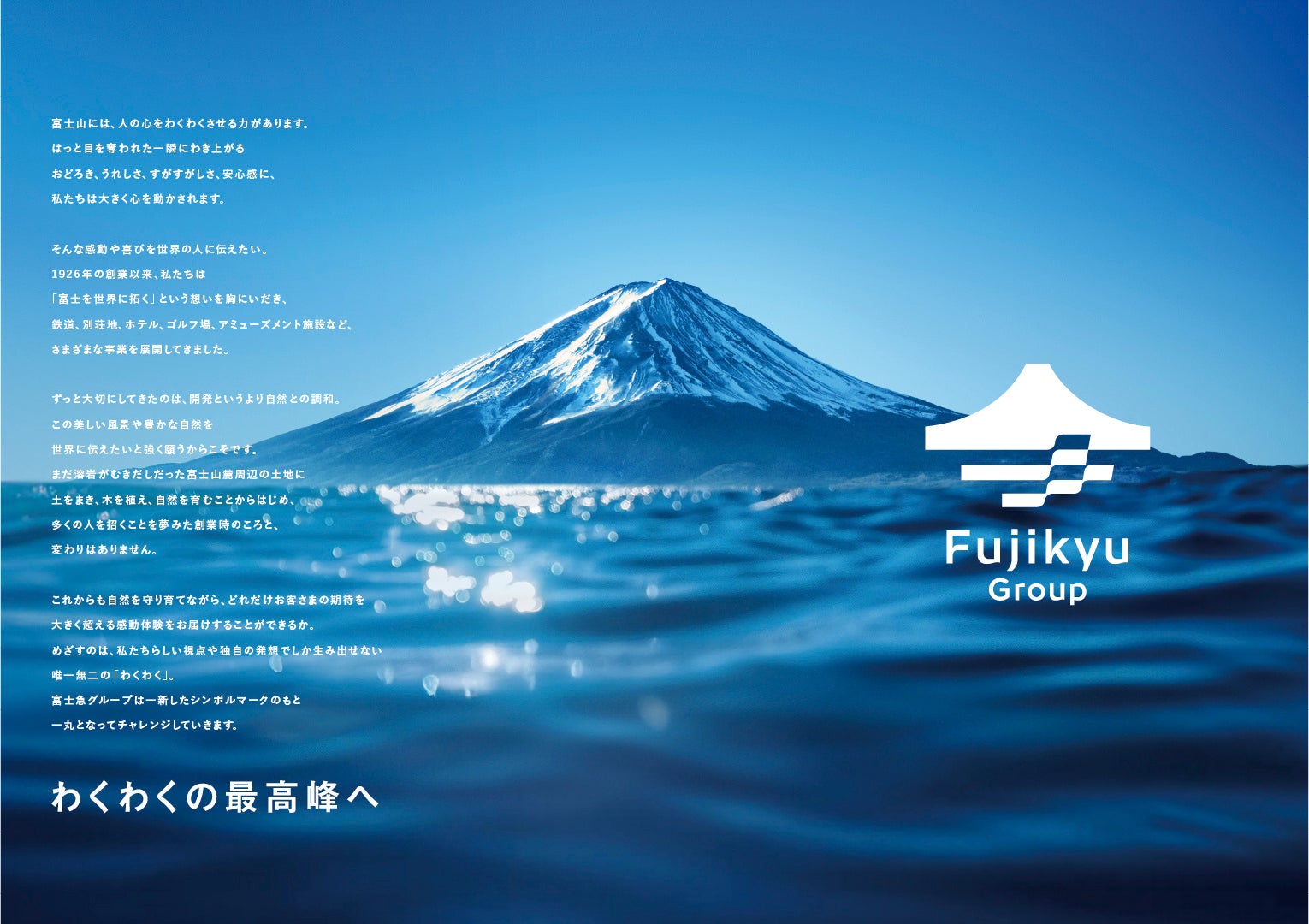 新しいグループロゴと合わせ、富士急グループのタグラインを「わくわくの最高峰へ」と定めました。「わくわく」は、経営理念にも掲げられている「喜び・感動」を身近な言葉で表現。「最高峰」は、いちばん高い山という意味で富士山を象徴する言葉でもありますが、いちばん優れた物などを指すときにも使われる言葉であり、富士急グループが独自の方法で富士山の魅力を伝え、人々に「最上の喜びや感動」を届けようとする姿勢を表現しています。同時に、前向きに進んでいく姿をイメージさせる能動的な表現にすることで、富士急グループがずっと大切にしてきた開拓者精神、チャレンジスピリットも合わせて表現しています。