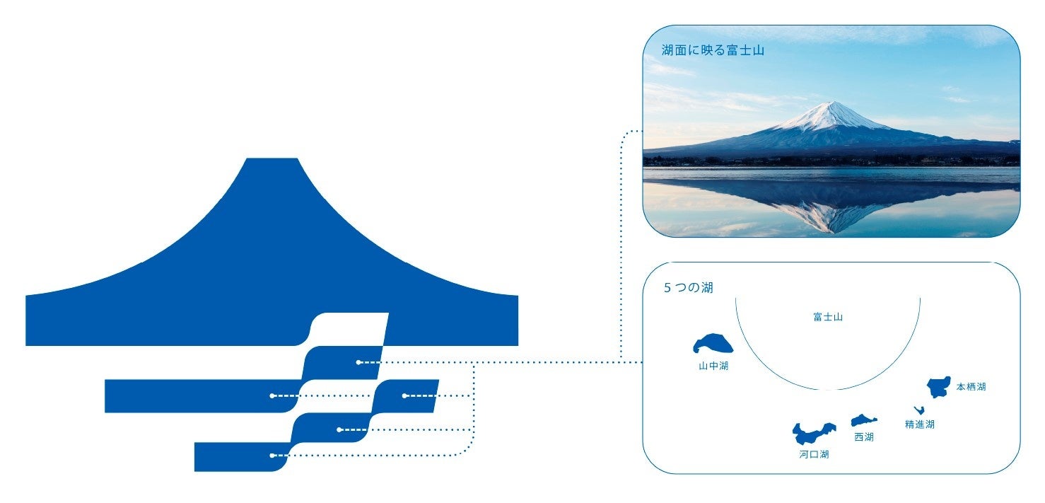 独自の発想で、新しいことに積極的に取り組む姿勢の象徴として富士五湖を表現すると同時に、富士急グループがさまざまな形で、富士山の新たな魅力を世の中に映し出し、伝えていく姿勢も、湖面に映し出される富士山で象徴しています。