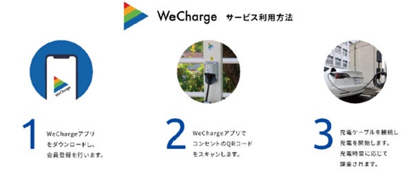 ユビ電の「WeCharge」電気自動車充電サービスでは、200Vコンセントで1時間あたり約20kmを走行可能(※5)とする電力量を充電できます。利用者は、充電コンセントに設置されたQRコードを専用の「WeChargeアプリ」で読み込むことで、電気自動車やプラグインハイブリッド車を充電できます。「WeChargeアプリ」は自動車の種類や、料金プラン、クレジットカードなどの情報を事前に登録することで、利用手続きから精算までをスマートフォンで完結できます。(※6)