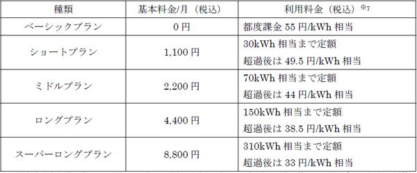 ※7. 電気自動車やプラグインハイブリッド車の電池容量や走行距離、充電時間などの車両情報をもとに、「kWh相当」を試算し、利用料金を定めています。計量器によりコンセントや充電器で電力量を測定する実測値の「kWh」とは異なります。
