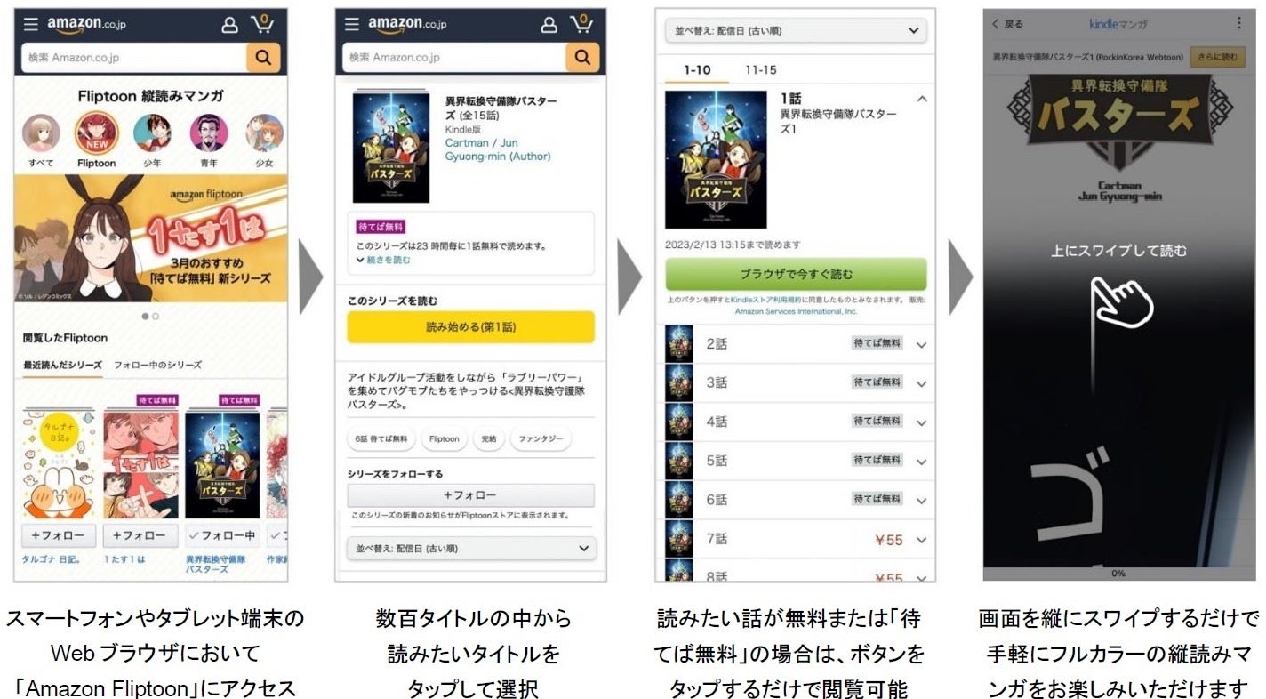 サービス提供開始時点では、数百の人気タイトルを取り揃え、「私のオジュン」「異界転換守備隊バスターズ」「タルゴナ日記。」といったAmazonによる国内独占配信タイトルもご用意しています。新たな作品や著者と出会うきっかけをお客様にご提供できるよう、Amazonは「Amazon Fliptoon」で新しい話を毎週公開していくとともに、国内外で人気のタイトルを順次増やしていく予定です。