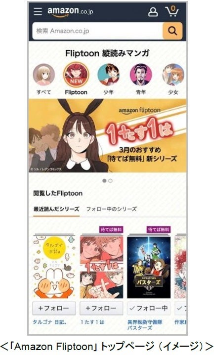 Amazonは、モバイル端末での閲覧に最適化されたフルカラーの縦読みマンガに特化した新サービス「Amazon Fliptoon (フリップトゥーン)」 ( http://www.amazon.co.jp/fliptoon )の提供を2023年3月7日(火)より日本において開始いたしました。「Amazon Fliptoon」のご利用にあたっては専用アプリのダウンロードは不要で、スマートフォンやタブレット端末のWebブラウザ上で縦読みマンガをいつでもどこでもお楽しみいただけます。「Amazon Fliptoon」のサービス提供開始時点では数百タイトル、1万話以上を読むことができ、そのうち数千話は無料(「待てば無料」対象の話も含む)でお楽しみいただけます。