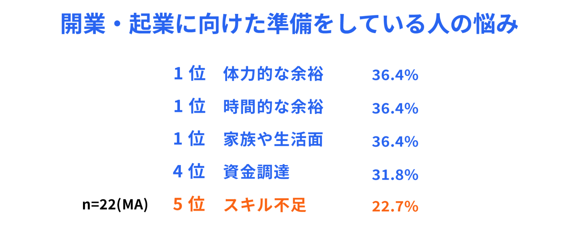 開業・起業をしたいと思っているが行動できていない、もしくはそもそもしたいと思わない人にその理由を質問したところ、最も多かったのは「スキル不足(44.5%)」でした。一方、開業・起業に向けた準備を行っている人の悩みランキングでは、「スキル不足」は最も少ない22.7%という真逆の結果になっており、自身のスキルへの自信が開業・起業に向けた第一歩のハードルになっていることが伺えました。