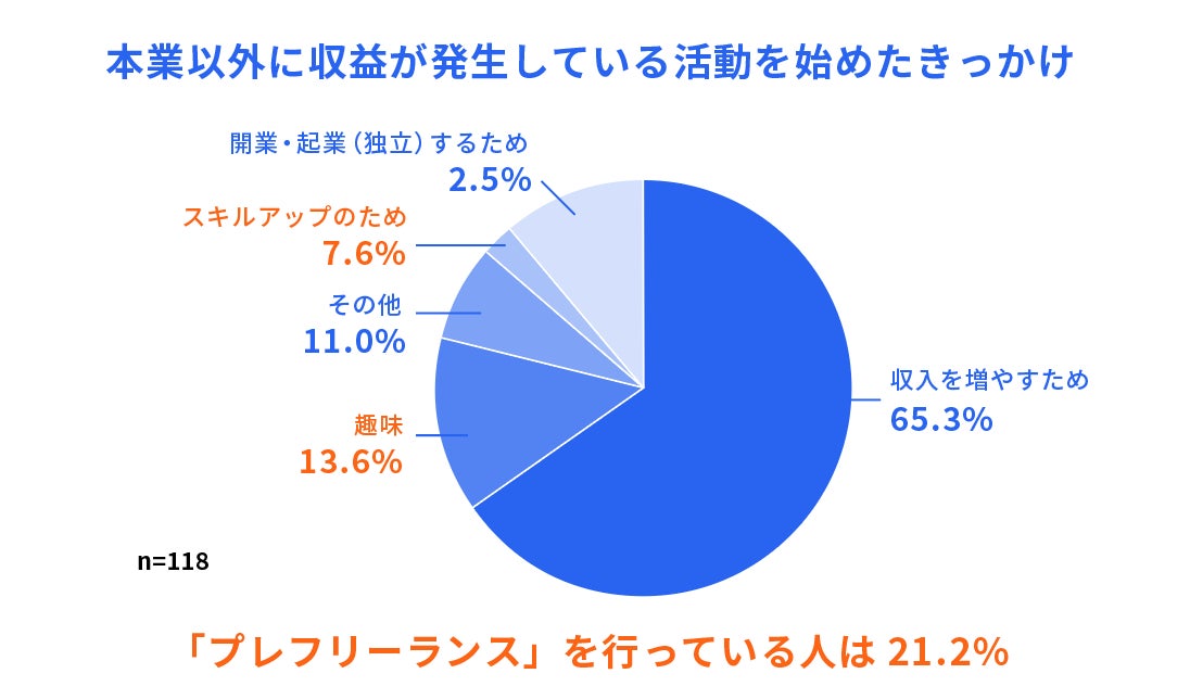 未開業層の中で本業以外で収入が発生している人に対して、その活動を始めたきっかけを質問したところ、「収入を増やすため」が65.3%と最も多い一方、「趣味」や「スキルアップのため」といった、収入や起業目的とは違う疑似的フリーランス活動『プレフリーランス』を行っている人が21.2%いる結果になりました。