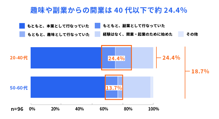 開業・起業層に対して、開業する前からその職種の経験があったかを質問したところ、本業で行っていた職種ではなく、副業や趣味で行っていた職種で開業した人は40代以下だと24.4%と約4人に1人が該当しました。これは全体の18.7%よりも約6%多く、若い世代の方がその割合が高くなる傾向がみられます。