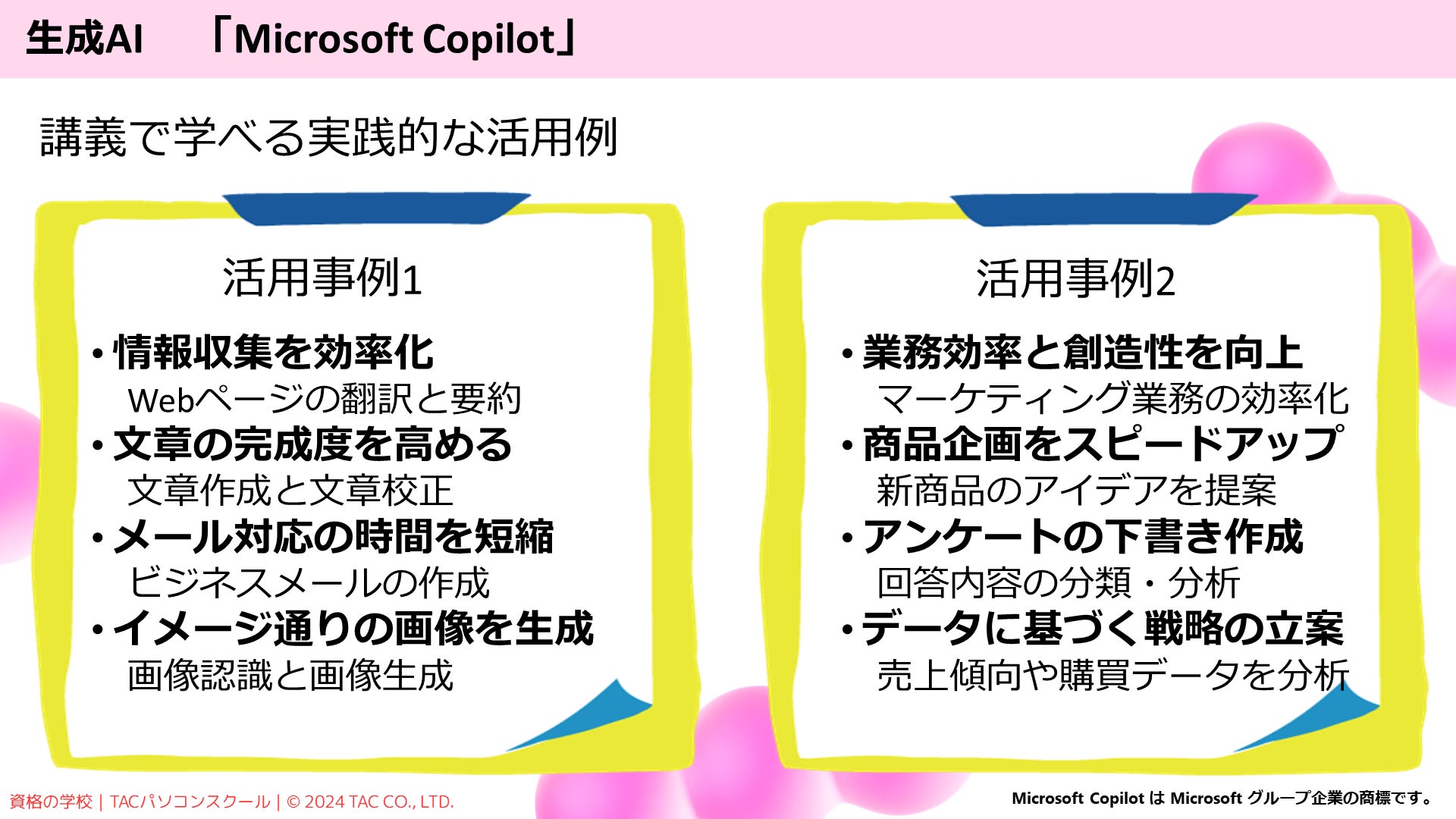 ※「働き方を変えるCopilot&Windows11」コースには、有料版のOfficeを操作する「Microsoft 365 Copilot」や「Copilot Pro」の内容は含まれておりません。