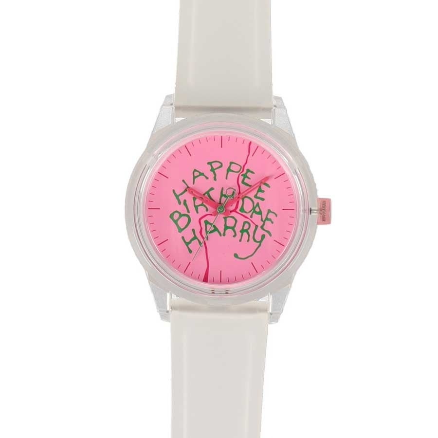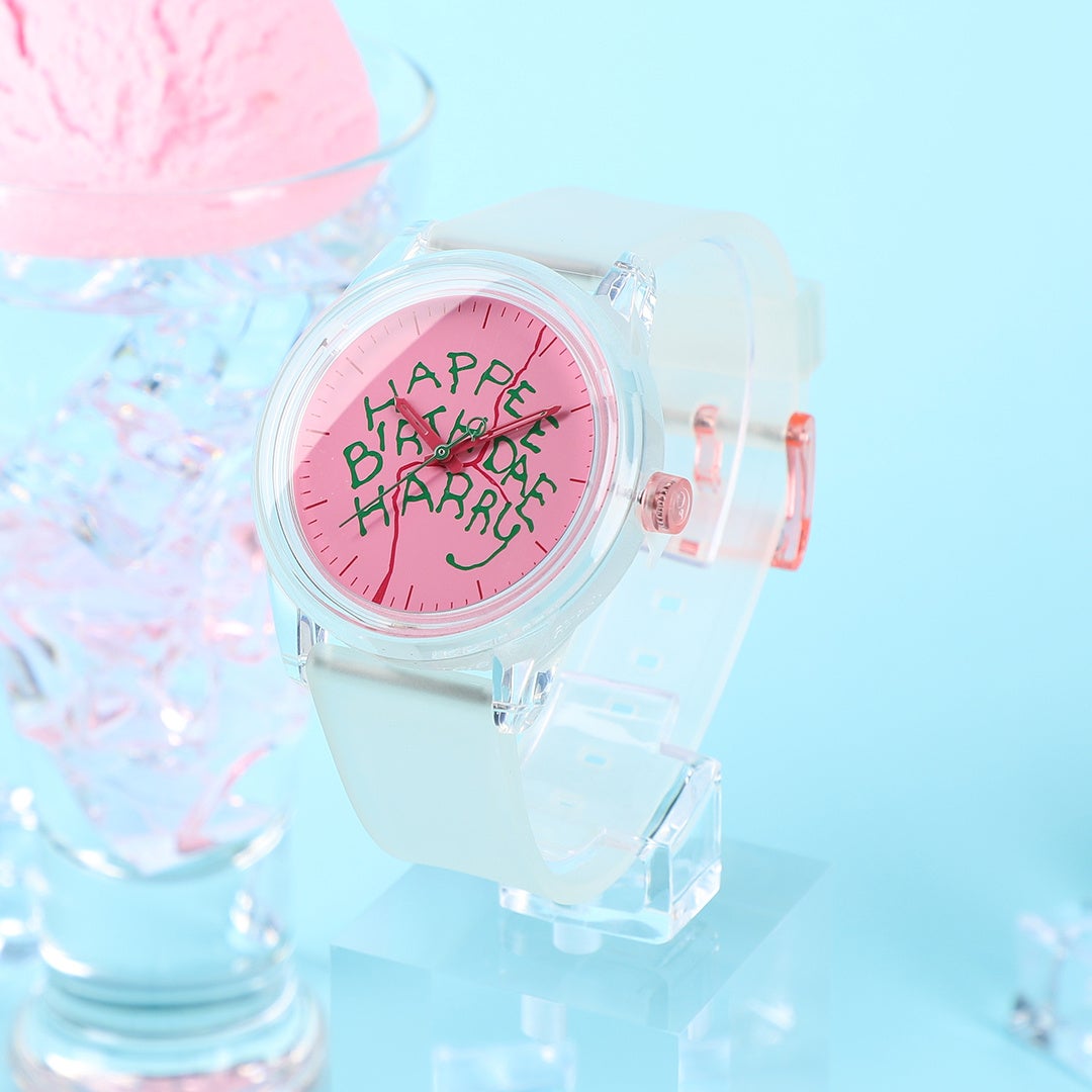 ハグリッドがハリーへ贈ったバースデーケーキをモチーフにしたデザインの、太陽光で充電可能な、電池交換不要のソーラー時計です。軽量のため長時間快適に着用することができます。半透明のバンドが文字盤のバースデーケーキデザインを引き立てるシンプルなデザイン。時計の針もケーキカラーになっています。