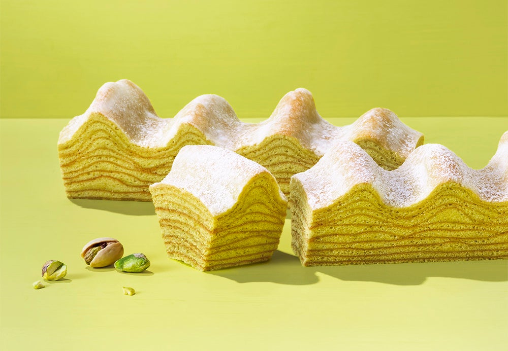 ナッツの女王「ピスタチオ」を惜しみなく使用しました。高品質として知られる“カリフォルニア産ピスタチオ”をじっくりと焙煎し、旨味たっぷりのペースト状に。濃厚なバター風味の生地にとろりと練り込んで、一層一層丁寧に焼き上げました。外はカリッと、中はしっとり熟成。ピスタチオとバターが出会うことで生まれる芳醇なコクとふくよかな甘みは、まさに贅沢。ひとくち頬張るとたちまち広がる、香ばしいピスタチオフレーバーも存分にお楽しみください。