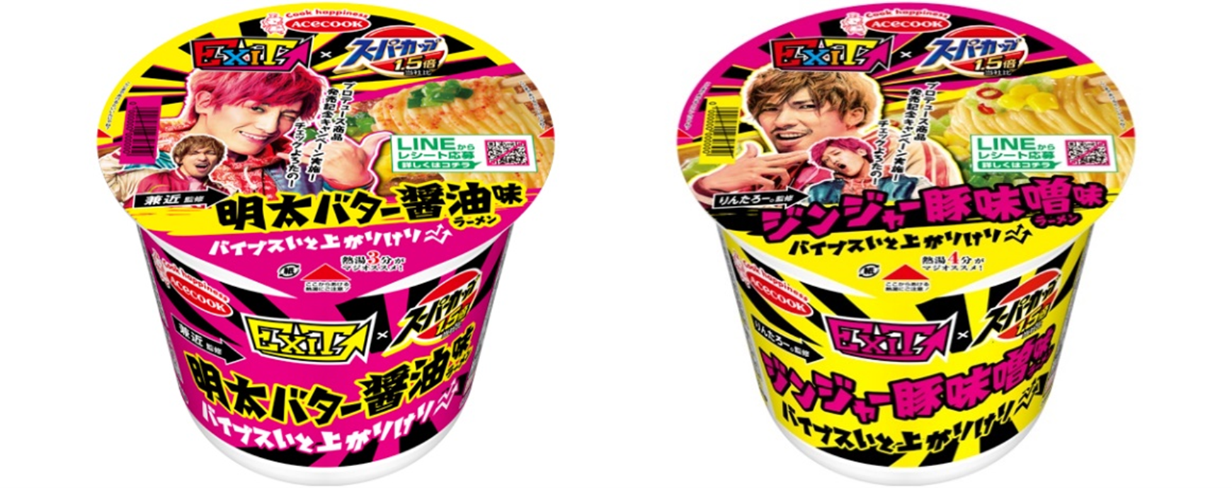 スーパーカップブランドのCMタレントでもある「EXIT」が監修した一杯が完成。ラーメンフリークとして知られる兼近さんから「明太×バター×醤油の組み合わせ、それすなわち神!」というアイディアをいただき完成させた「明太バター醤油味ラーメン」と、相方のりんたろー。さんから「野菜たっぷりのラーメンマジテンション上がる」というアイディアをいただき完成させた、野菜たっぷり仕様の「ジンジャー豚味噌味ラーメン」の2種を発売します。二人のアツい想いを詰め込んだ、心もお腹もいっぱいになる一杯です。