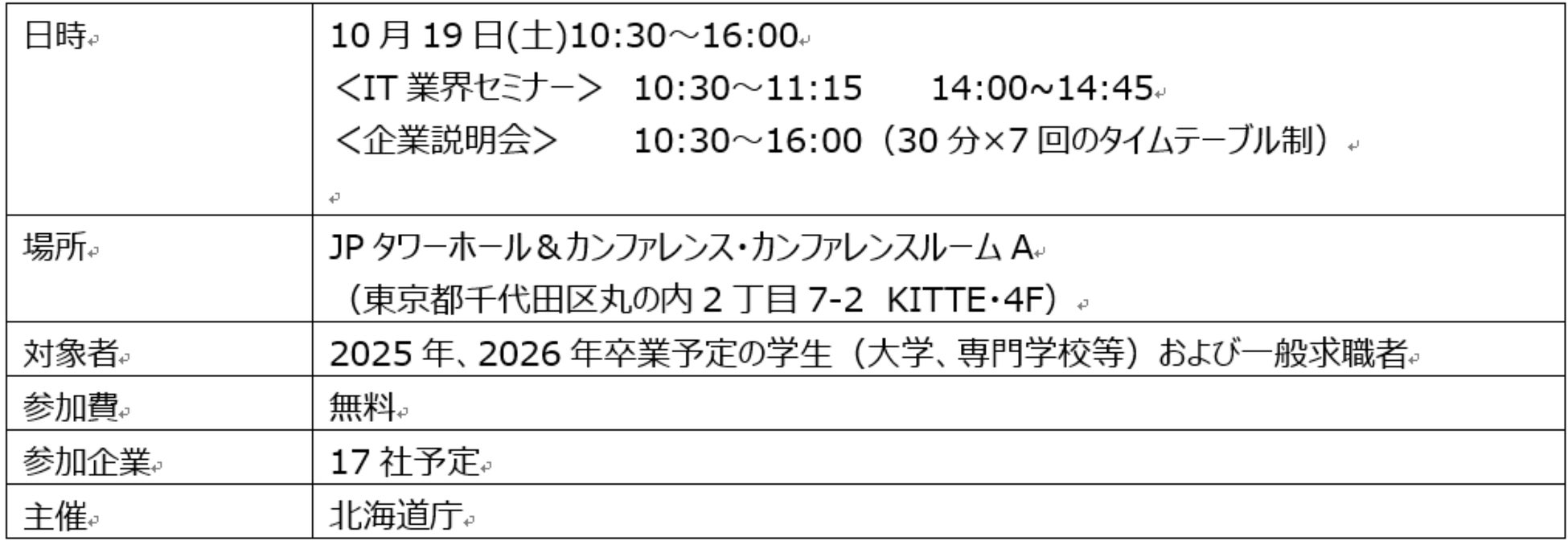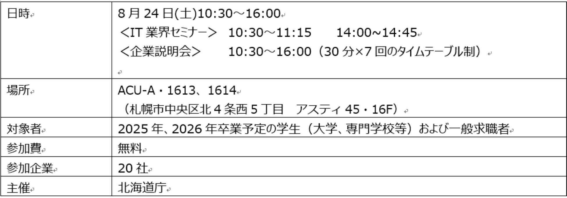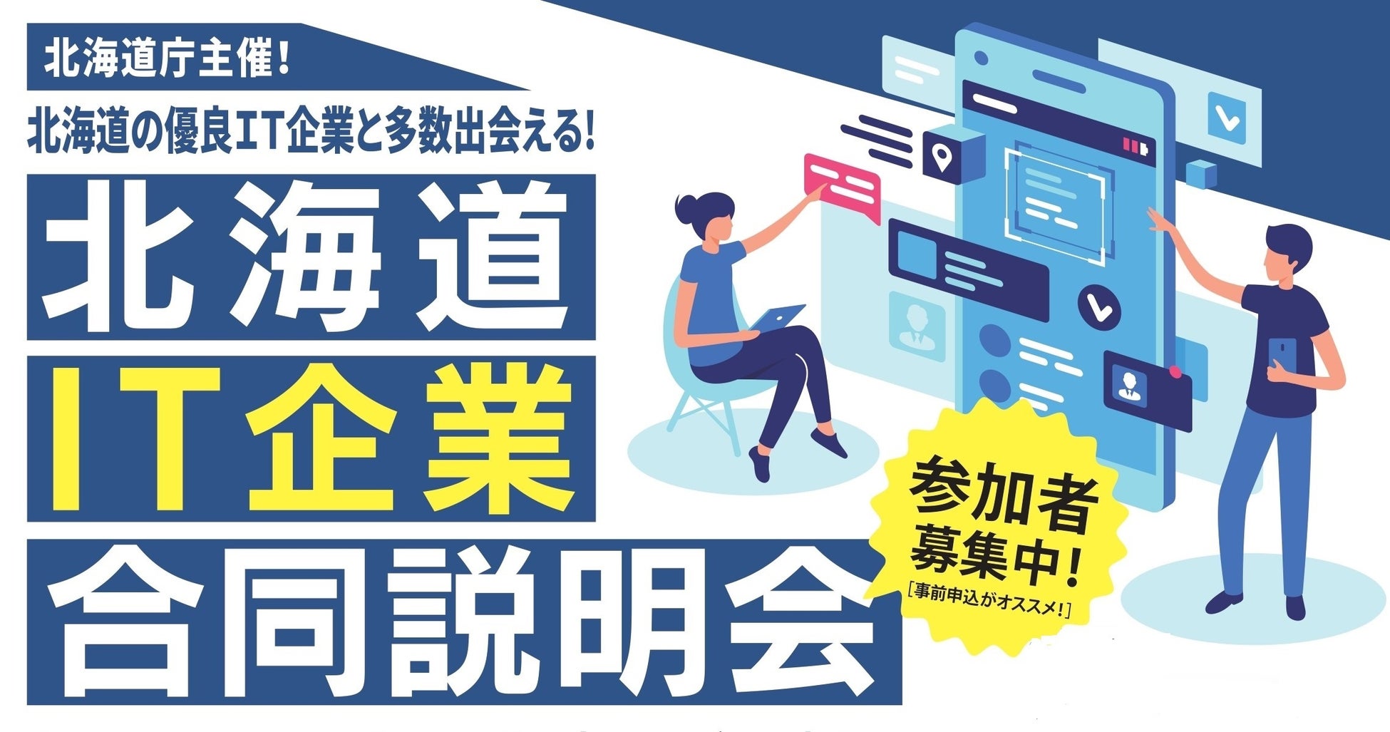 本説明会は、「北海道IT企業合同説明会」と題し、札幌市と東京都千代田区丸の内で、学生や一般求職者を対象に、北海道の優良IT企業約20社が参加する企業説明会を開催します。