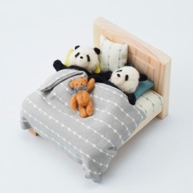 手作りの木製ベッドに羊毛フェルトでできた双子パンダが仲良く眠っています。