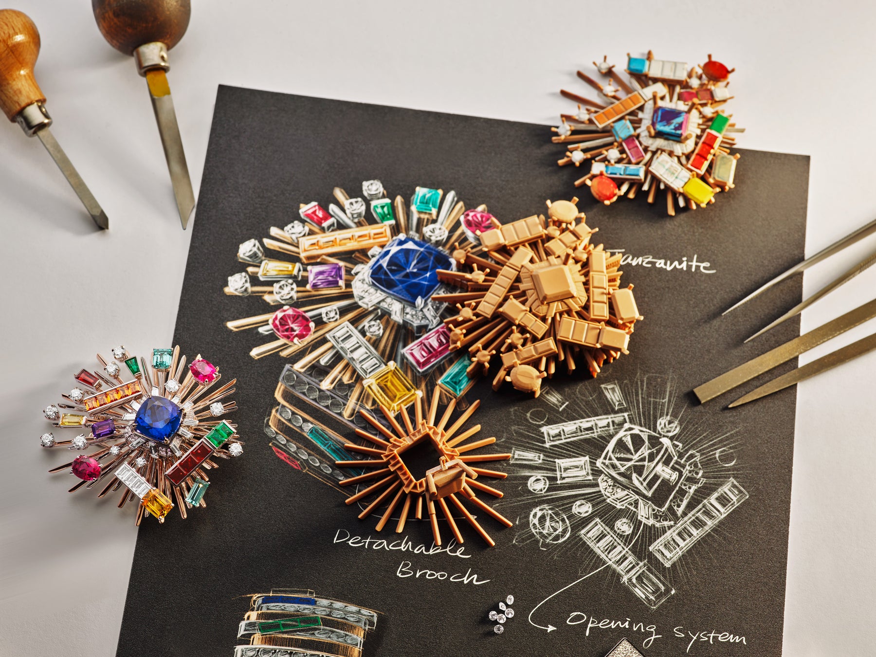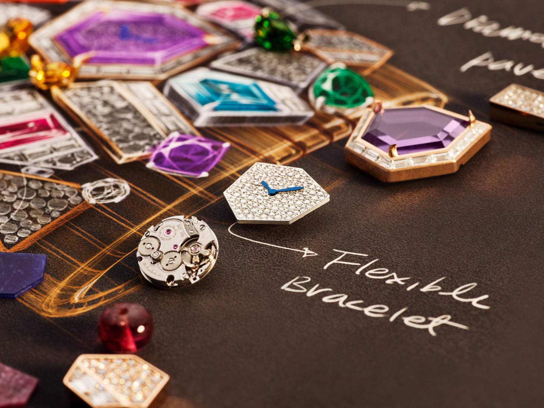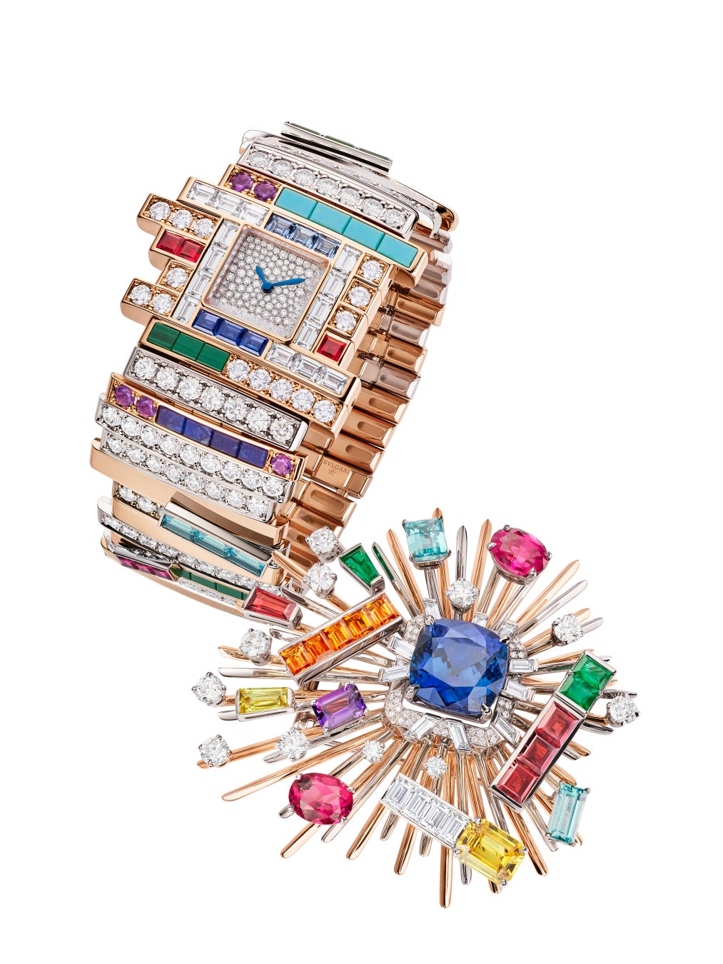 コレクションの真髄に沿ったシークレットウォッチ「Gioco di Forme e Colori(ジョーコ ディ フォルメ エ コローリ/色彩と形象の調べの意)」は、ブルガリが持つローマのルーツとユニークで素晴しい色彩の感性に敬意を捧げた作品です。創造性と職人技が華麗に結実したこの芸術作品は、ダイヤルの蓋が取り外し可能なブローチになっており、12.34カラットのタンザナイトのセンターストーンがあしらわれています。ローマの燦燦と輝く太陽をイメージしたゴールドのラインにより、様々な形にカットされたエメラルド、サファイア、ルビー、ガーネットなどのジェムストーンのカスケードが散りばめられた色とりどりの輝きが強調されています。この類いまれなるクリエイションの仕上げとして、また最も先進的でダイナミックなマキシマリズムへの賛美としてぞれぞれのリンクパーツが右から左に動く遊び心溢れるブレスレットが選ばれました。