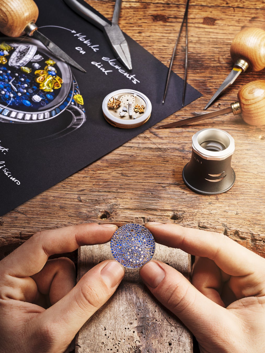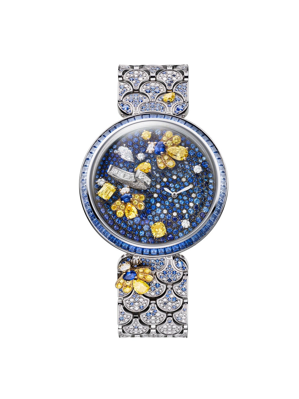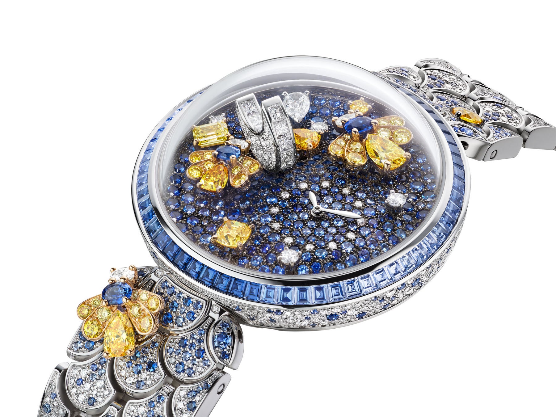蛍の光に照らされたローマの闇夜を描いた「Notte Stellata Diva(ノッテ ステラータ ディーヴァ/星空の歌姫の意)」は、極上なる優美さへの賛美です。ブルガリのアイコニックなカボションカットをイメージしたドーム型の蓋が付いたダイヤルには、プリンセスカットダイヤモンドがセットされた月とパヴェスノーセッティングが輝き、さらにイエローダイヤモンドとブルーサファイアで形づくられた2匹の蛍がかすかに揺れています。傑出したラグジュアリーさはダイヤルにとどまらず、蛍が1匹とまったグラデーションのブルーサファイアがあしらわれた、しなやかで着け心地のよいブレスレットにも引き継がれています。 「ポリクロマ」は、ローマの日中の神々しい光の色だけでなく、夜のローマの神秘的な色も探求しています。「ノッテ ステラータ ディーヴァ」のダイヤルは規則性を持たず、ちょうど満天の星が輝く夜空のように神秘と隠れた側面に溢れています。