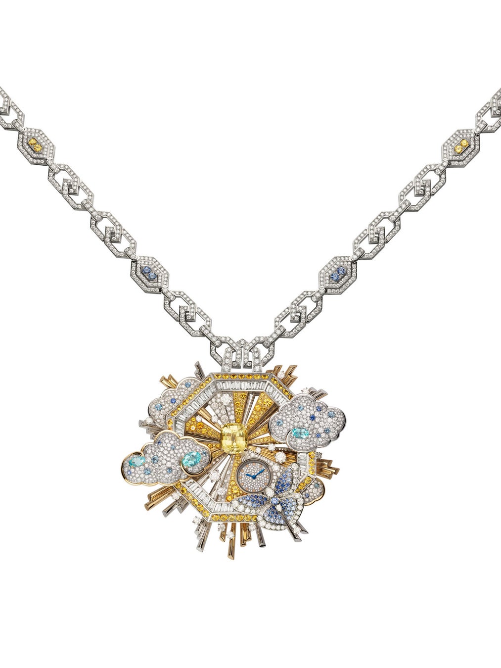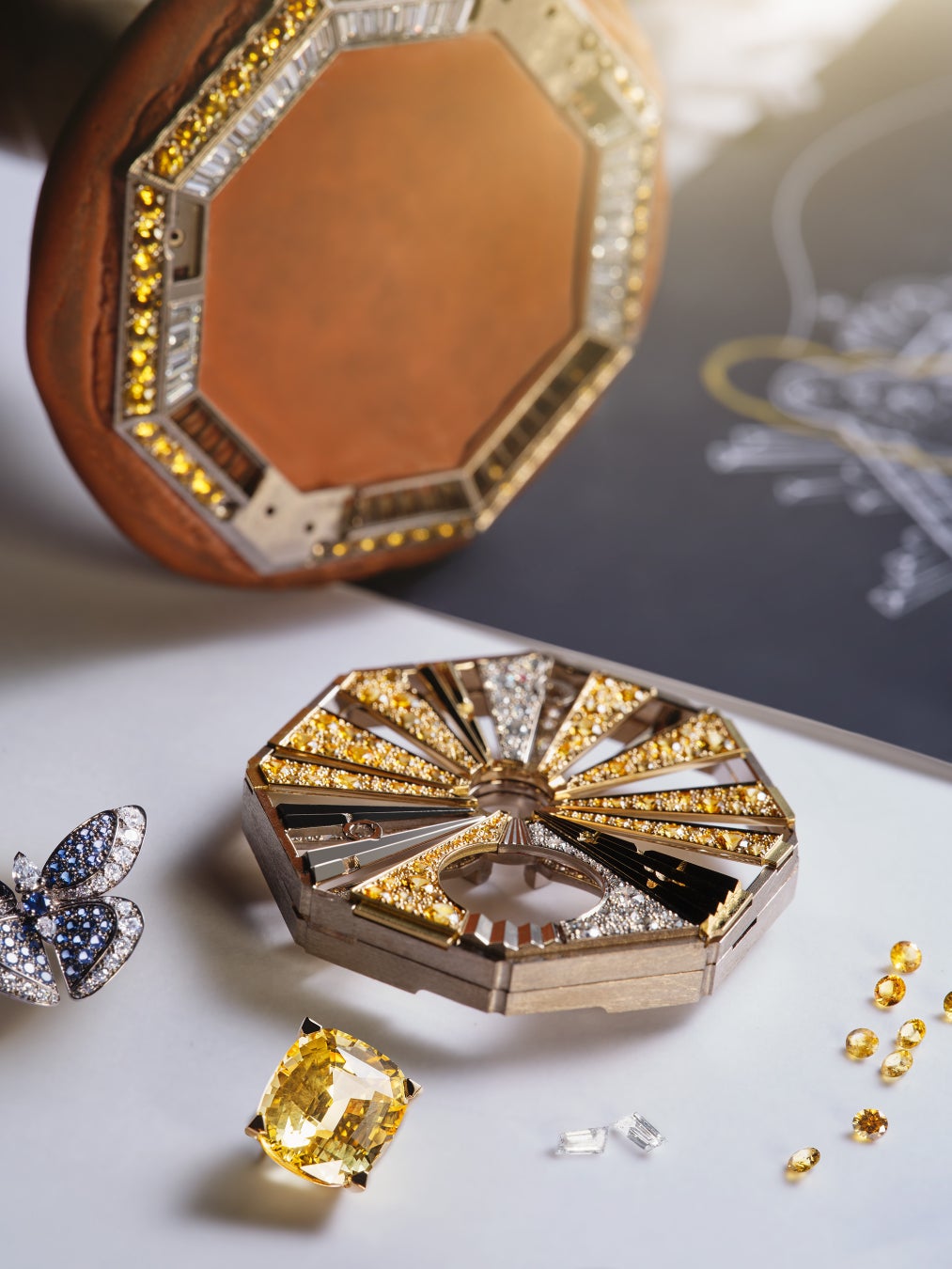 多様な姿で現れるローマの美しさにインスパイアされた「Nuvole Preziose(ヌヴォレ プレツィオーゼ/典雅なる雲の意)」ペンダントウォッチは、マクセンティウスのバシリカの天井を模した8角形になっています。完成までに1,560時間を要したこの見事なペンダントウォッチは、ダイヤルの中央に6.88カラットの認定済みクッションカットイエローサファイアが瞬き、トレンブランの先にはヴィンテージのブルガリブローチにインスパイアされた蝶が揺れ、漂う雲は取り外してイヤリングとしても纏うことができます。イエローゴールドとホワイトゴールドのミックスで作られた放射線は、ローマのサンタ・マリア・デッラ・ヴィットーリア教会にあるジャン・ロレンツォ・ベルニーニの祭壇画に現わされた天からの光にインスピレーションを得ています。雄大な自然とイタリアの光への敬意を、このピースを彩る輝かしい天上の色で表現しているのです。