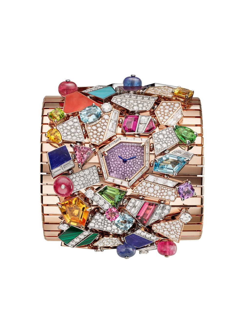 「Tubogas e Colori(トゥボガス エ コローリ/色彩とトゥボガスの意)」マンシェットウォッチでは、シグネチャーであるトゥボガスを称え、しなやかなローズバージョンにして大胆なジェムストーンとハードストーンの組み合わせにより装飾されています。トルマリンやシトリン、ルベライトからソーダライト、ターコイズ、マラカイト、さらにコーラルまで、多彩な色と幾何学的な形が細やかに並んでいます。6.65カラットの透き通った天然アメジストがダイヤルの美しい蓋となり、大胆で艶やかな印象を演出します。