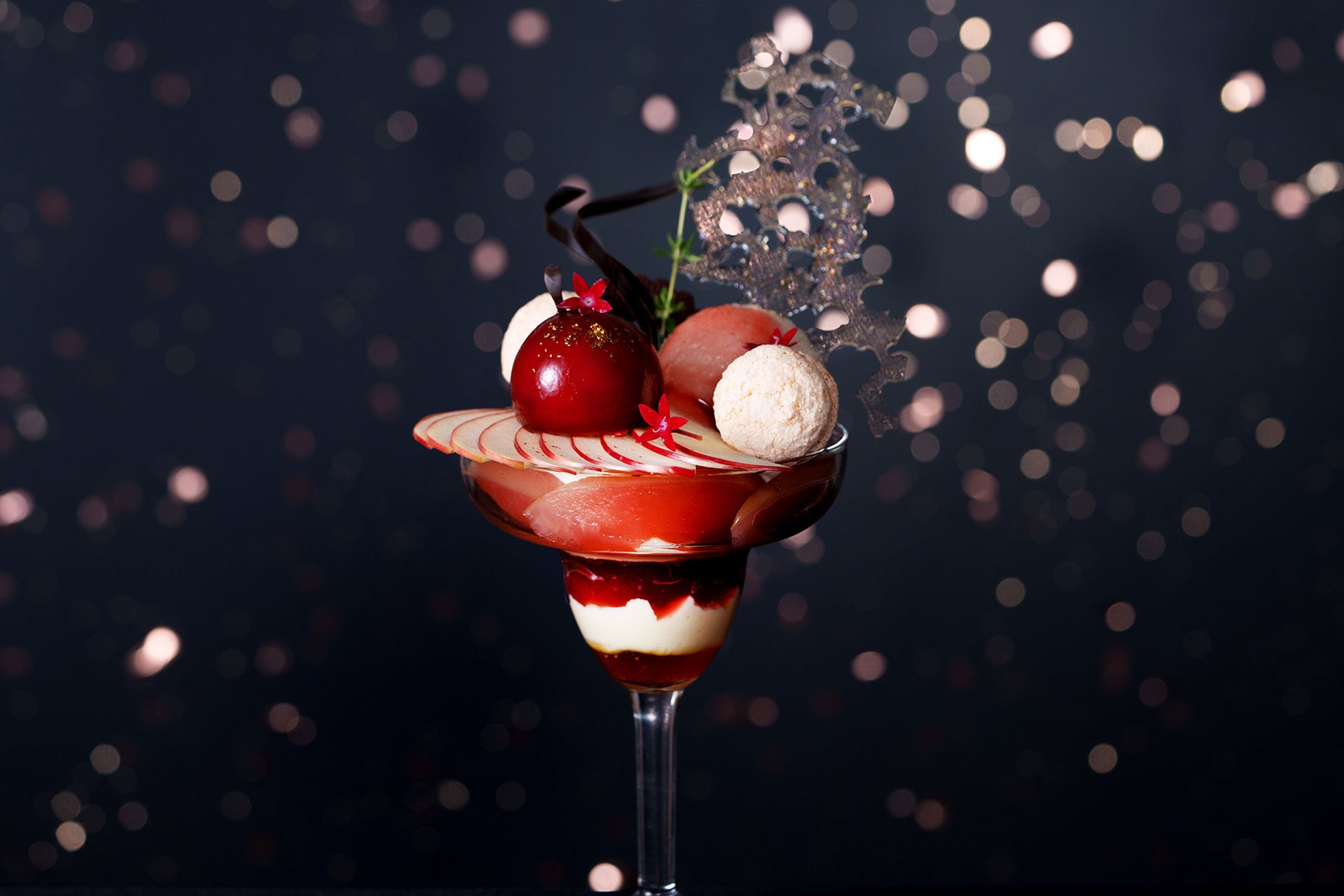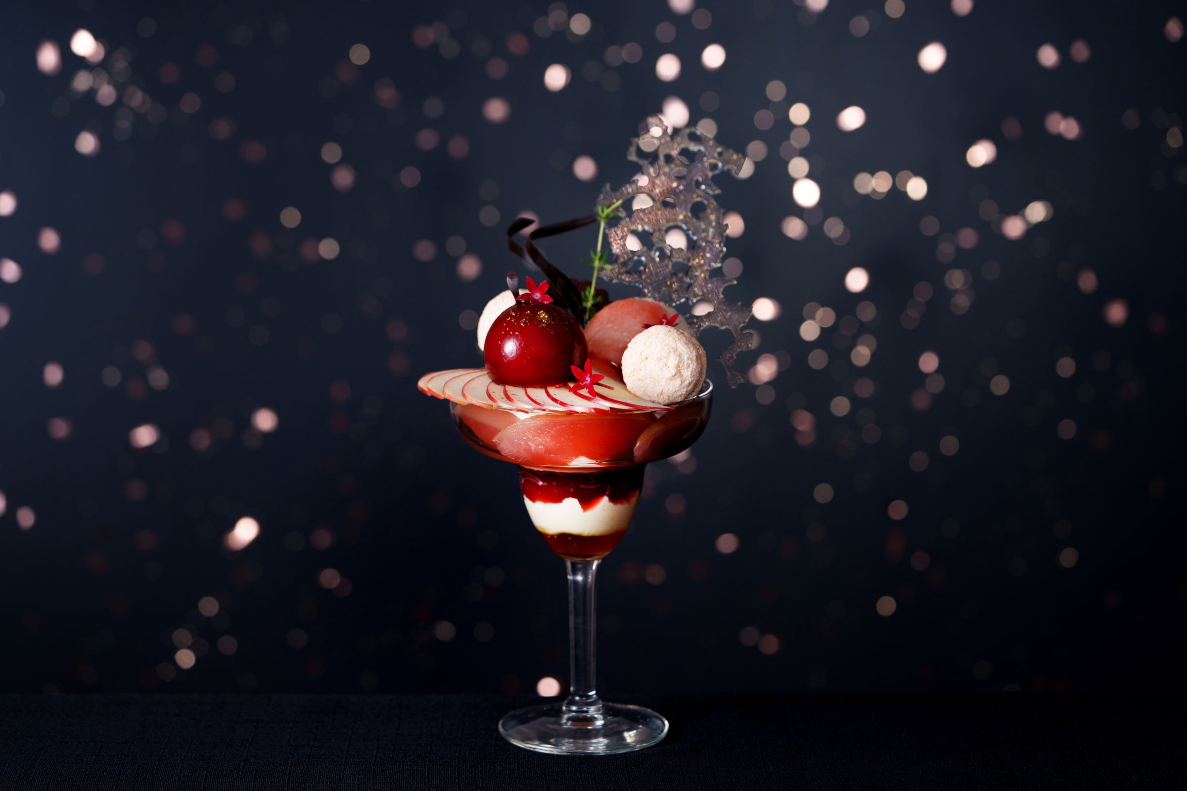 季節のフルーツや食材が持つ美味しさを最大限に引き出した、パティシエのイマジネーション光るシーズナルパフェ。旬のりんごと香り高いアールグレイ紅茶を組み合わせました。フレッシュりんごやコンポート、紅茶のジュレやアイスクリームを重ね、トップには惑星に見立てたりんごジュレを忍ばせた紅茶のムースや、放射状のりんごをあしらいました。