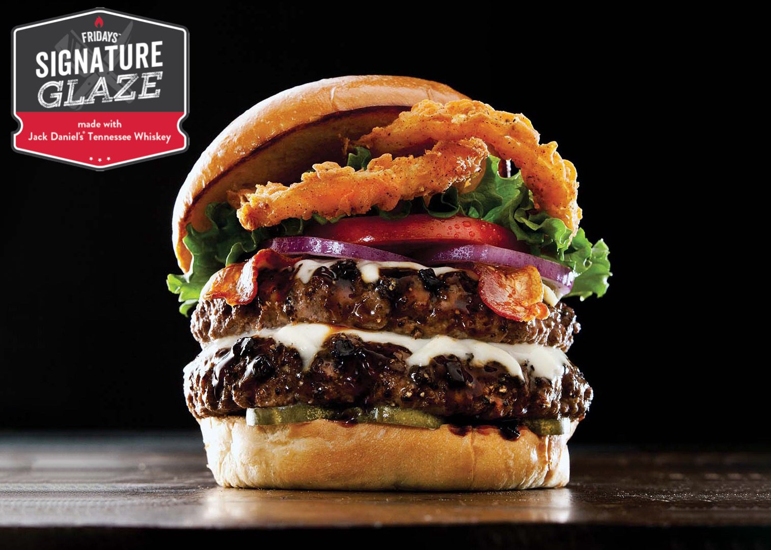 フライデーズシグネチャーソースで味付けしたジューシーな200gのビーフパテをなんと2枚!モッツアレラチーズ、クリスピーベーコン、ケイジャンオニオンと共にトーストしたバンズで挟みました。