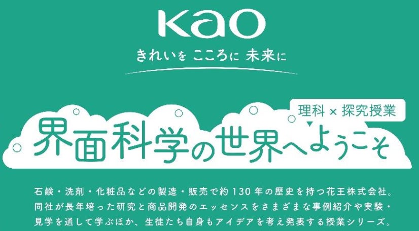 アタックネオやキュキュット、リセッシュでおなじみの花王株式会社様のプログラムを制作支援しました。花王の研究員をお招きし、製品を用いた実験や会社見学を通して学び、生徒からも商品アイデアを考え発表するシリーズ授業のプログラムです。