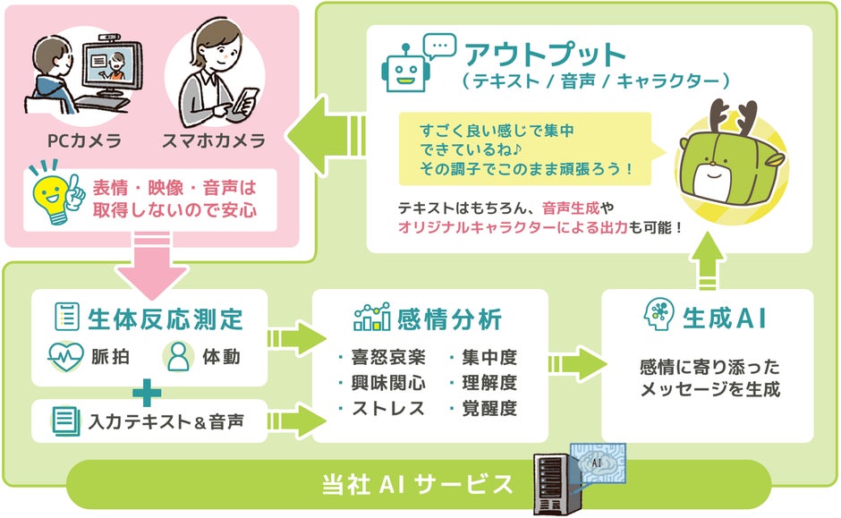 パソコンやスマートフォンに付属のカメラで計測した生体データを基に、学習者の感情状態をリアルタイムで解析し、生成AIが個別最適化されたフィードバックを提供する画期的なサービスです。ひとりひとりの感情状態の変化からAIが能力・適性・性格などを分析し、学習者に合わせてパーソナライズされた学習支援を自動的に提供できるようになります。