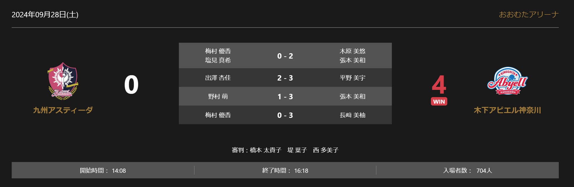 ノジマTリーグ 2024-2025シーズン 公式戦 9月28日開催 九州アスティーダ vs 木下アビエル神奈川 試合結果