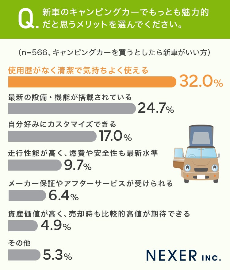 続いては、「新車を購入したい」と答えた方に、新車のキャンピングカーでもっとも魅力的だと思うメリットを選んでもらいました。