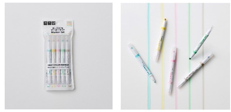【内容】ラインマーキングと細かな文字書きが1本でできる2WAY仕様のマーカーセットです。使う人に前向きで優しい気持ちになってほしいという想いから生まれた情緒的なカラー(爽やかな青、前向きな黄、和みのピンク、穏やかな緑、落ち着きの茶)の5色セットです。