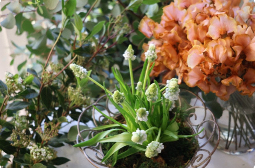 瑞々しい花材と球根のアレンジメントを作りましょう。(※写真はイメージです。花材は仕入れによります。)